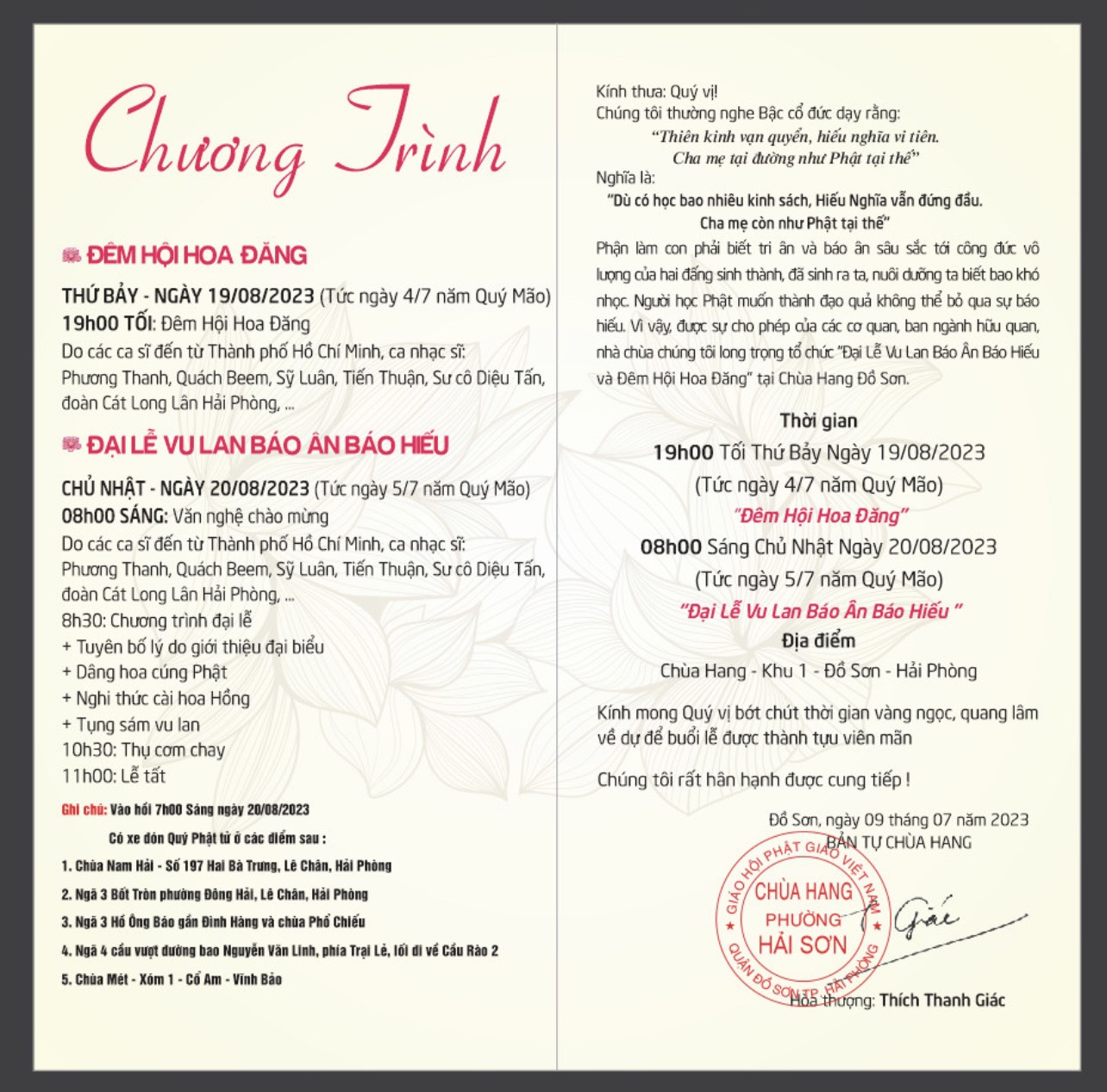 Trên tinh thần tri ân báo ân của người con Phật, cũng như thực hiện Thông bạch số 719/TB-HĐTS ban hành ngày 04/08/2023 của Hội đồng trị sự TƯ GHPGVN và Thông bạch của Ban trị sự GHPGVN thành phố Hải Phòng về việc hướng dẫn tổ chức Đại lễ Vu lan Báo hiếu PL. 2567 – DL. 2023, Chùa Hang ( Khu 1, quận Đồ sơn, thành phố Hải Phòng) long trọng tổ chức Đại lễ Vu lan Báo hiếu PL. 2567 – DL. 2023 trong 2 ngày 19 và 20/08/2023 (nhằm ngày 04 và 05/07 năm Quý Mão). Chương trình cụ thể như sau: