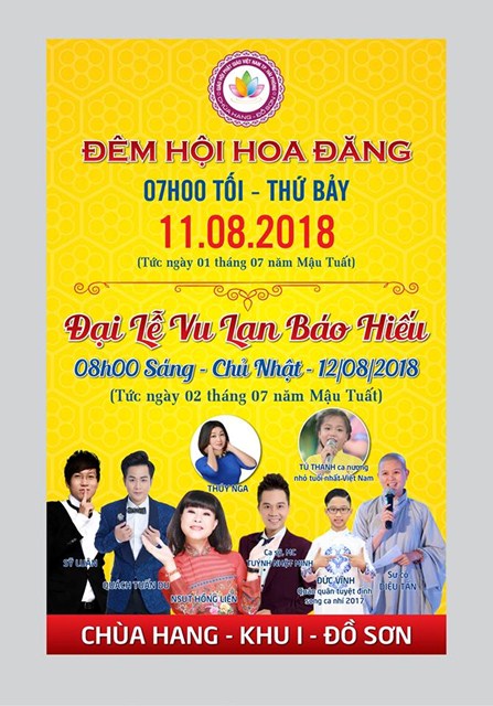 Được sự đồng ý của BTS GHPGVN Thành Phố Hải Phòng và Ban trị sự GHPGVN quận Đồ Sơn, chùa Hang ( Cốc tự), khu I, phường Vạn Sơn, quận Đồ Sơn, TP. Hải Phòng sẽ tổ chức Đêm nhạc và đêm Hội hoa đăng nhân mùa Vu Lan – Báo Hiếu PL.2562 – DL.2018 nhằm tri ân tổ tiên, ông bà, cha mẹ, cầu nguyện thế giới hòa bình, chúng sinh an lạc, cầu nguyện cho anh linh các anh hùng liệt sỹ, đồng bào tử nạn trong chiến tranh sớm được siêu thoát vào lúc 19 giờ ngày 11 tháng 8 năm 2018 ( nhằm ngày 01/7/Mậu Tuất). Đêm nhạc kính mừng Đại lễ Vu lan PL. 2562 – DL. 2018 có sự tham gia của các văn nghệ sỹ đến từ TP.HCM, thủ đô Hà Nội và thành phố Hải Phòng: NSƯT. Hồng Liên, Ca sỹ Quách Tuấn Du, ca nhạc sỹ Sỹ Luân, ca sỹ MC Tuýnh Nhật Minh, ca sỹ Thúy Nga, ca nương nhỏ tuổi nhất Việt Nam, bé Tú Thanh, Quán quân tuyệt đỉnh song ca nhí 2017, bé Đức Vĩnh…