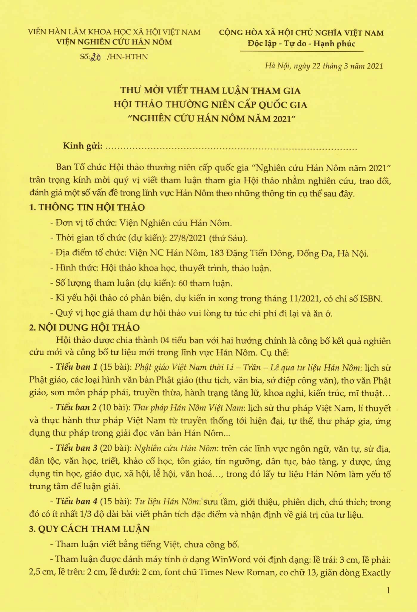 Ban Tổ chức Hội thảo thường niên cấp quốc gia “Nghiên cứu Hán Nôm năm 2021” trân trọng kính mời quý vị viết tham luận tham gia Hội thảo nhằm nghiên cứu, trao đổi, đánh giá một số vấn đề trong lĩnh vực Hán Nôm theo những thông tin cụ thể sau đây.