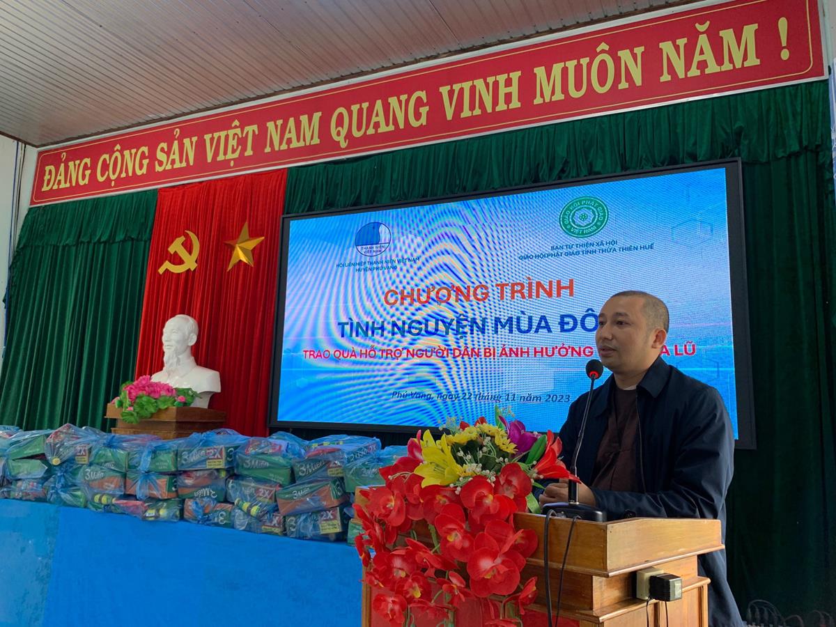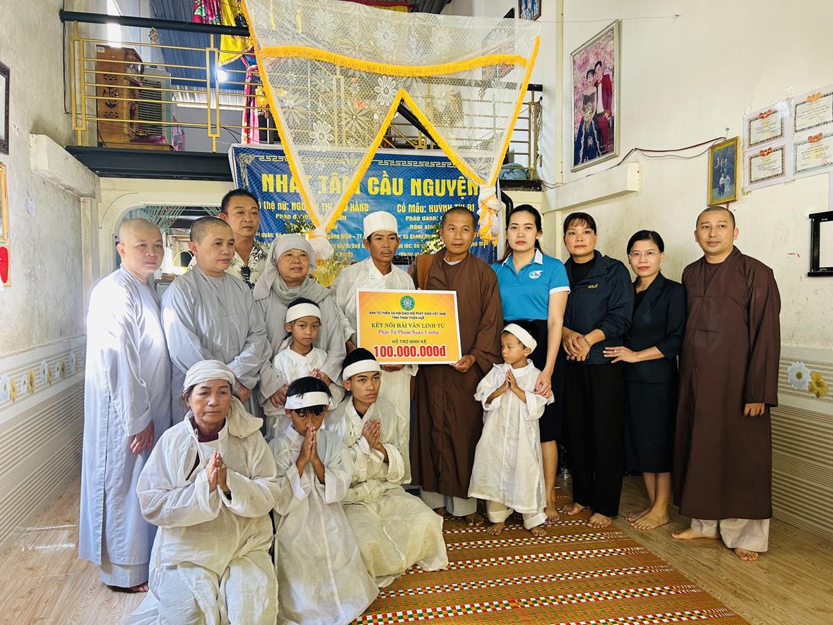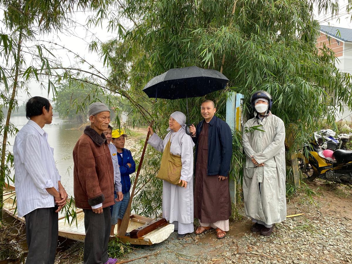 Đặc biệt, thấu hiểu nỗi đau khi có người thân không may qua đời do lũ lụt, để kịp thời chia sẻ, động viên và có phương thức hỗ trợ phù hợp, vừa qua Ban Từ thiện xã hội cùng với Thượng tọa Thích Thiền Hạnh – Phó trưởng ban kiểm soát GHPGVN tỉnh đã kết nối với Phật tử Phạm Xuân Cương, Phạm Xuân Tuyển và Lê Minh Bảo đến thăm hỏi và trao sinh kế 100 triệu đồng cho gia đình Anh Nguyễn Đình Đức trú tại phường Hương Sơ, thành phố Huế (có người thân là vợ và con gái không may qua đời do lật ghe, bị nước lũ cuốn trôi).