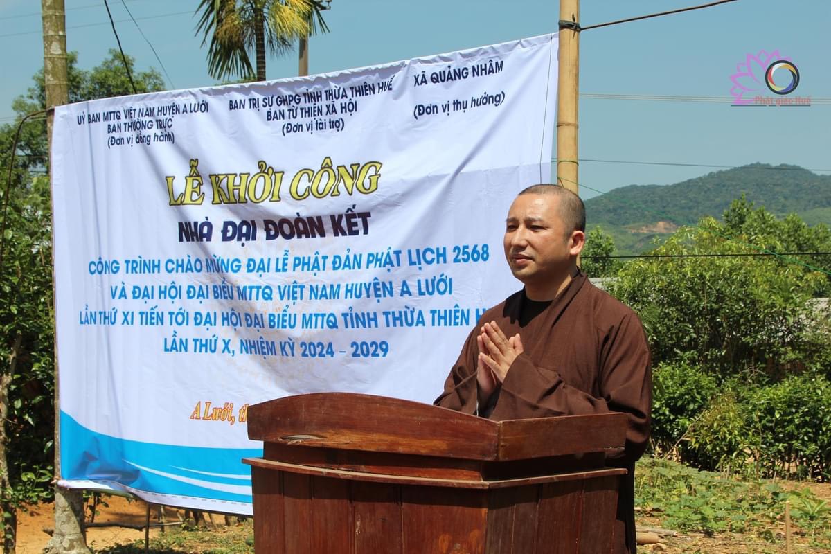Phát biểu tại buổi lễ, Đại đức Thích Huệ Trọng – Phó Trưởng Ban Thường trực Ban Từ thiện Xã hội GHPGVN tỉnh nhấn mạnh rằng Ban Từ thiện xã hội GHPGVN tỉnh luôn quan tâm thực hiện công tác an sinh xã hội, vì mục tiêu không bỏ ai ở lại phía sau. Việc hỗ trợ xây dựng nhà ở cho hộ nghèo, hộ có hoàn cảnh khó khăn là việc làm có ý nghĩa thiết thực. Đặc biệt, mỗi ngôi nhà đại đoàn kết được xây dựng thể hiện cho truyền thống đoàn kết, gắn bó, tương trợ nhau của mỗi con người Việt Nam.