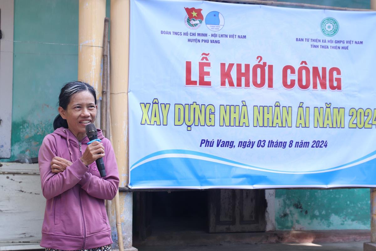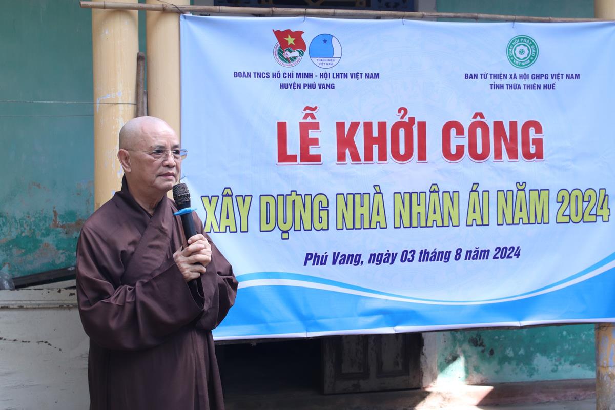 Sáng ngày 03/8/2024, Ban Từ thiện xã hội Giáo hội Phật giáo Việt Nam tỉnh Thừa Thiên Huế phối hợp với Ban Thường vụ Huyện đoàn, Hội Liên hiệp Thanh niên huyện Phú Vang đã tổ chức Lễ khởi công xây dựng nhà Nhân ái cho gia đình bà Đỗ Thị Hạnh, thuộc đối tượng gia đình hộ nghèo, có hoàn cảnh đặc biệt khó khăn tại Tổ dân phố Hòa Tây (thị trấn Phú Đa, huyện Phú Vang, tỉnh Thừa Thiên Huế).