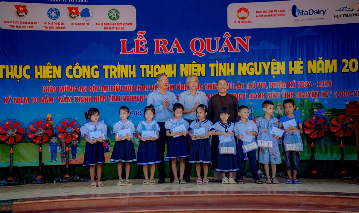 Tại buổi lễ, Ban Từ thiện xã hội GHPGVN tỉnh Thừa Thiên Huế đã trao 70 thùng sữa dinh dưỡng Vitadairy trị giá 35 triệu đồng cho các em học sinh ở các trường tiểu học trên địa bàn thị xã. Ngay sau Lễ ra quân, đã phối hợp tổ chức Lễ khởi công xây dựng nhà nhân ái cho Bà Nguyễn Thị Em (thôn 4, xã Bình Tiến, thị xã Hương Trà) trị giá 50 triệu đồng.