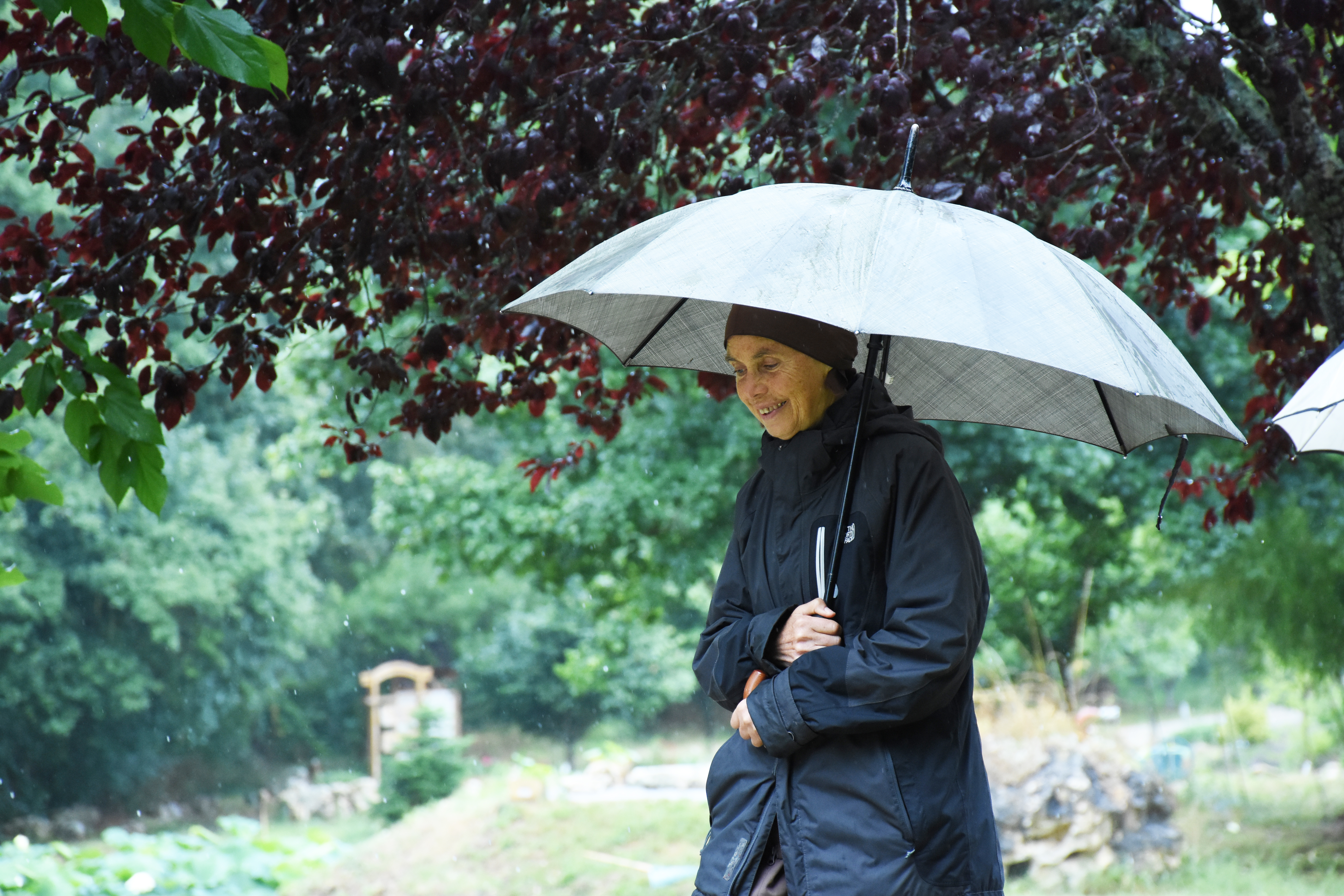 Tôi cũng thích thực tập như vậy khi đi bên ngoài, tuy ít chậm hơn. Đôi lúc sự thực tập buông thư trong từng bước chân có thể là một thử thách lớn. Thí dụ, khi tiếng chuông báo chúng được thỉnh lên, chúng ta có cảm tưởng rằng chúng ta phải vội hơn để đi đến điểm sinh hoạt kế tiếp. Khi chúng ta bước đi một cách vội vàng, chúng ta không buông thư được trong từng bước chân. Thay vì vậy, chúng ta đi để cho mau đến một nơi nào đó. Trong những lúc như thế, tôi thực tập buông bỏ sự vội vàng để có thể nghỉ ngơi trong mỗi bước chân. Điều này có thể là một sự thử thách, vì trong tôi có tiếng nói rằng nếu không nhanh chân tôi sẽ bị trễ. Nhưng thực ra, nếu không vội vàng, tôi có thể đến nơi sớm hơn, vì vội vàng đến từ lo lắng và năng lượng lo lắng là một năng lượng rất nặng nề, làm chậm bước chân tôi. Nếu buông bỏ được sự vội vàng và lo lắng, chúng ta sẽ di chuyển một cách nhẹ nhàng hơn, có mặt trong từng bước và đến nơi đúng giờ. Chúng ta có thể di chuyển nhanh mà không cần phải vội vàng.