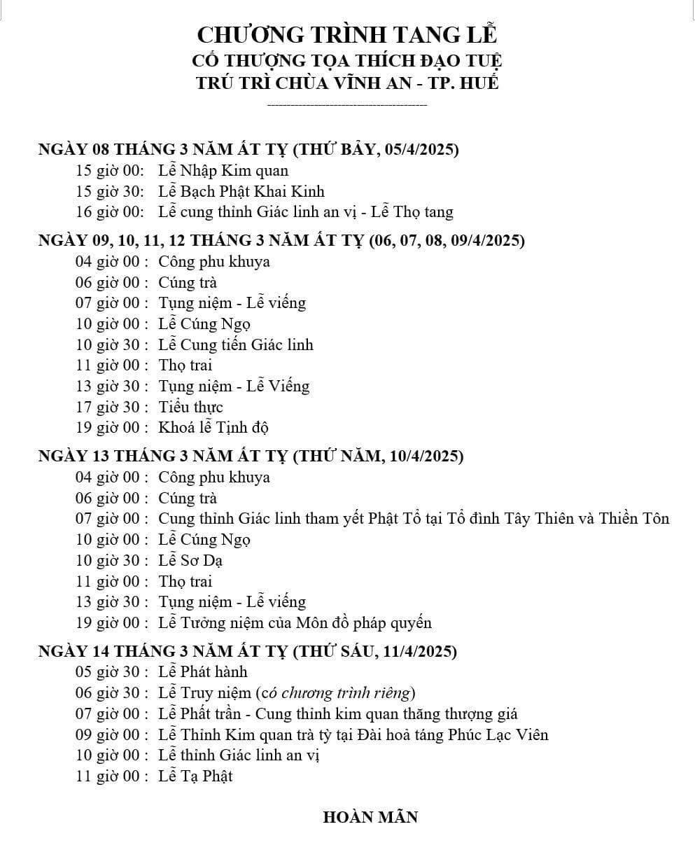 Lễ Viếng bắt đầu vào lúc 07 giờ 00 phút ngày 06 tháng 4 năm 2025 (ngày 09 tháng 3 năm Ất Tỵ); đến ngày 09 tháng 4 năm 2025 (ngày 12 tháng 3 năm Ất Tỵ); Lễ Truy niệm vào lúc 06 giờ 30 phút ngày 11 tháng 4 năm 2025 (ngày 14 tháng 3 năm Ất Tỵ);