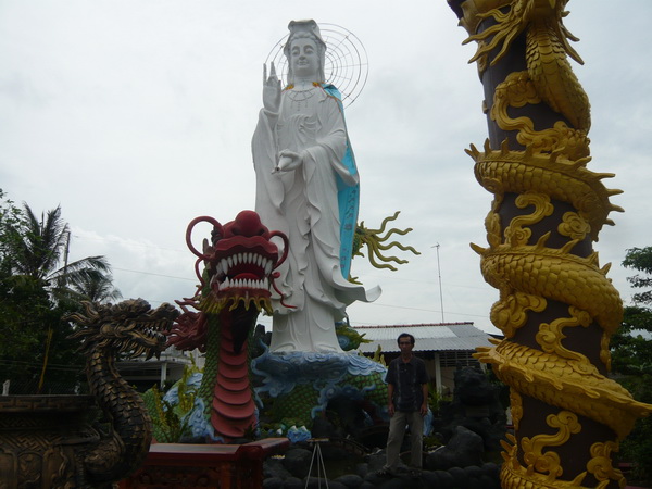 Hình ảnh Quán Thế Âm Bồ Tát ngự tọa trên lưng một con rồng đang cuộn mình trên hòn giả sơn được khách chiêm bái đánh giá cao.