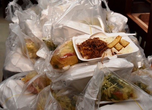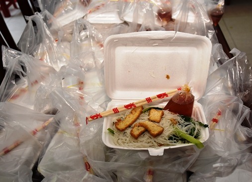 Những phần ăn bao gồm;  cơm và mì xào. Tại đây, chủ tiệm chay và nhân viên trực tiếp phát cho bà con .