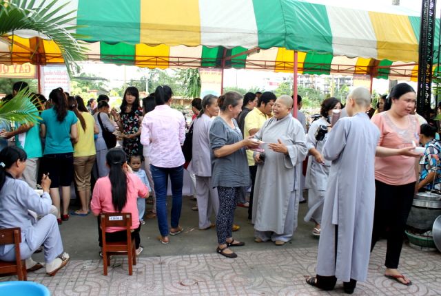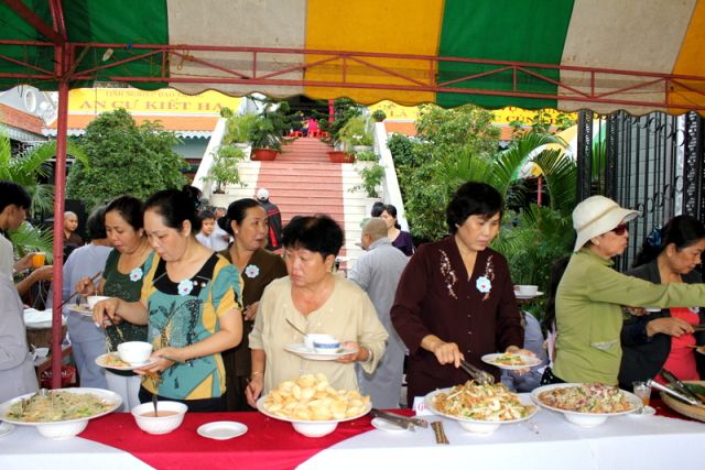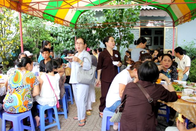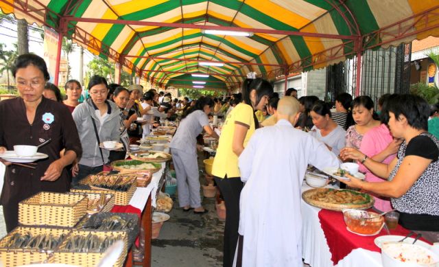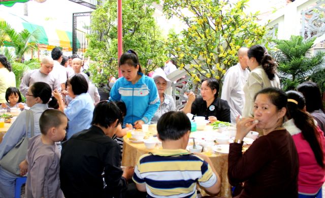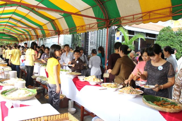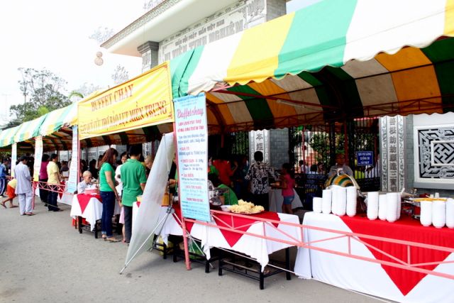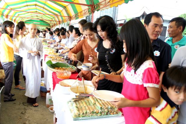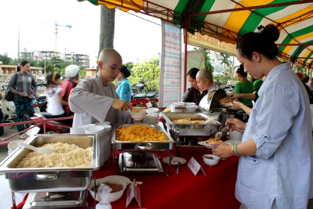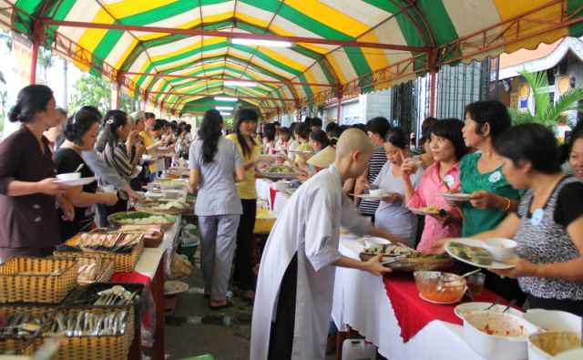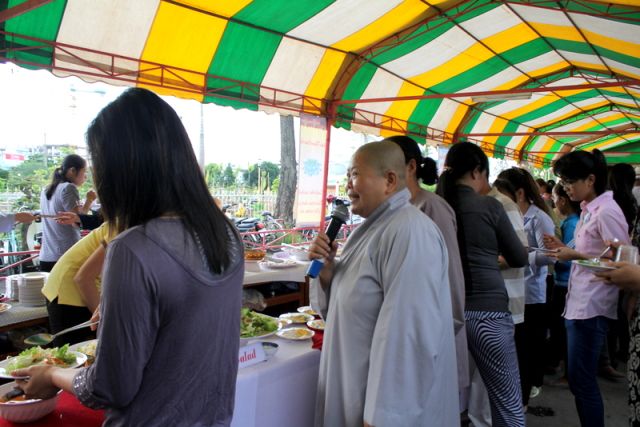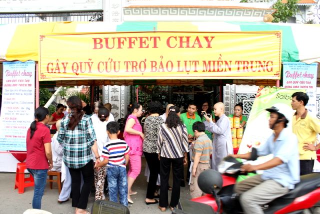 Trên tinh thần đó, nên gần 1.000 Phật tử thiện hữu trí thức, thiện nam tín nữ thập phương, các nhà hảo tâm đến tham dự và ủng hộ cho chương trình buffet chay với hình thức bán vé vì mục đích từ thiện, tức không phải họ đến đây chỉ để thưởng thức những món ngon mà là chia sẻ cùng đồng bào mình đang sống trong cảnh màn trời chiếu đất.