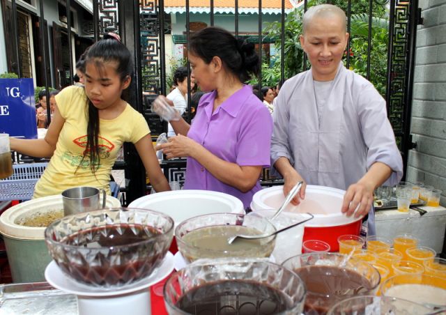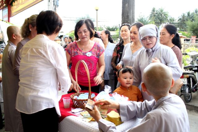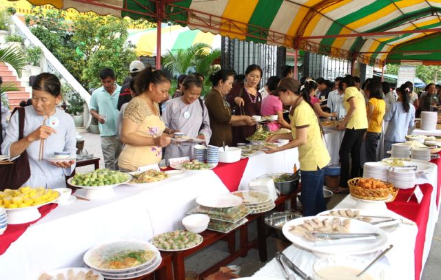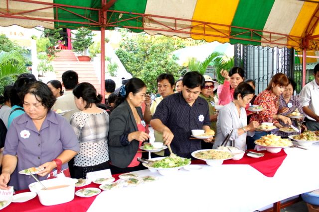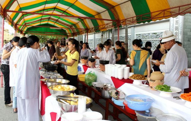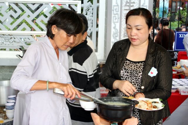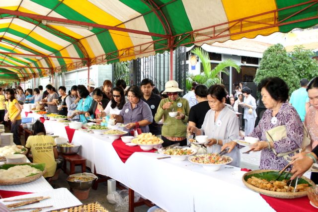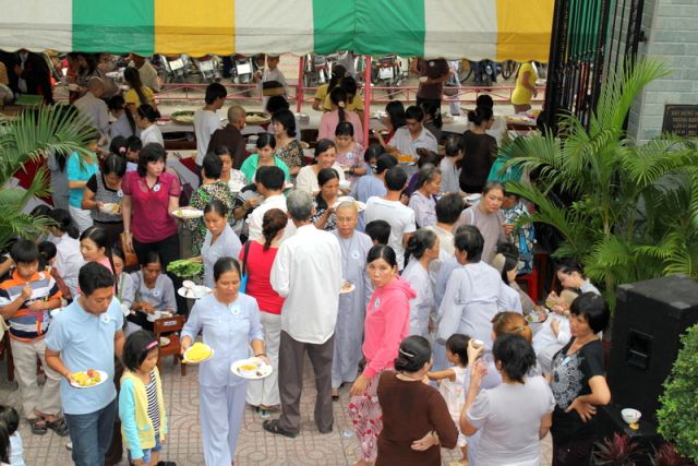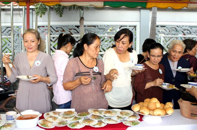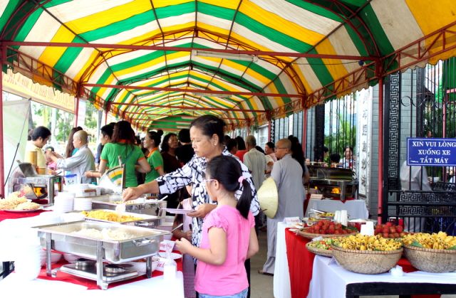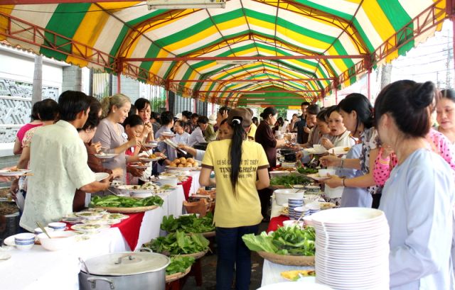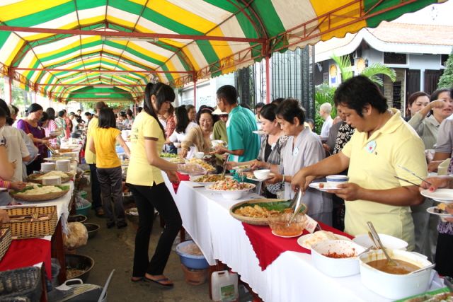 Trên tinh thần đó, nên gần 1.000 Phật tử thiện hữu trí thức, thiện nam tín nữ thập phương, các nhà hảo tâm đến tham dự và ủng hộ cho chương trình buffet chay với hình thức bán vé vì mục đích từ thiện, tức không phải họ đến đây chỉ để thưởng thức những món ngon mà là chia sẻ cùng đồng bào mình đang sống trong cảnh màn trời chiếu đất.