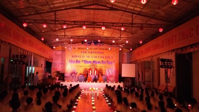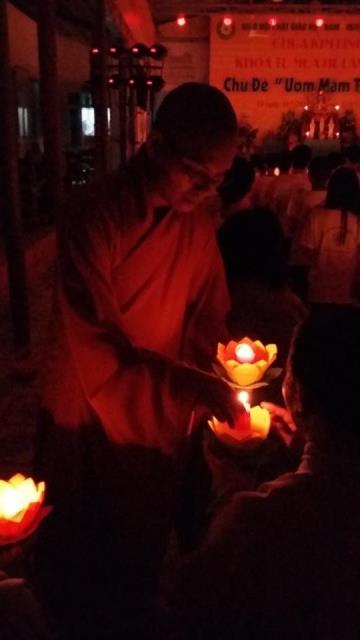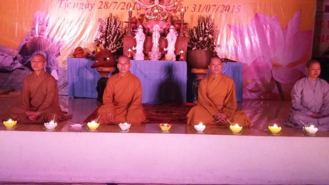 Chứng minh và tham dự chương trình lễ bế mạc và đốt nến có sự hiện diện của ĐĐ. Thích Quảng Cường – Phó Trưởng Ban Trị sự kiêm Chánh thư ký GHPGVN tỉnh Tiền Giang, ĐĐ. Thích Thiện Tâm – Phó Trưởng Ban Trị sự GHPGVN tỉnh Tiền Giang, trụ trì Chùa Kim Linh, Trưởng Ban tổ chức khóa tu, ĐĐ. Thích Thiện Hiền – Phó thư ký kiêm Chánh văn phòng GHPGVN tỉnh Tiền Giang, SC. TN. An Mai – Giáo thọ trường Trung cấp Phật học Tiền Giang, ĐĐ. Thích Pháp Như, SC.TN Nhuận Bình điều phối chương trình lễ bế mạc và đốt nến cùng quý phụ huynh, quý Phật tử và hơn 150 khóa sinh đồng tham dự.