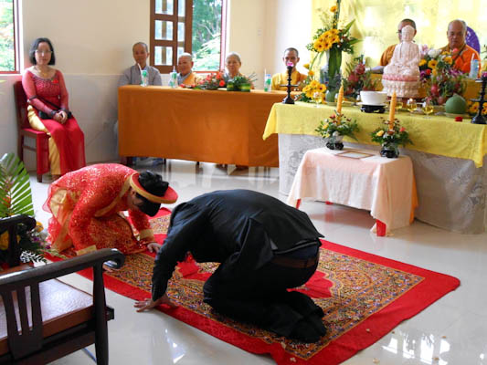 Ngay tại Tam Bảo, giữa không gian thật trang nghiêm mang màu sắc tôn giáo, chú rể và cô dâu chắp tay thành kính thực hiện các nghi thức Phật giáo theo sự hướng dẫn của chư Tăng với niềm hạnh phúc rạng rỡ trên khuôn mặt. Phía dưới là sự chứng kiến của họ hàng hai bên và các Phật tử đồng đạo cùng bạn bè.