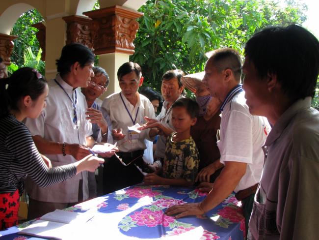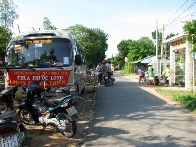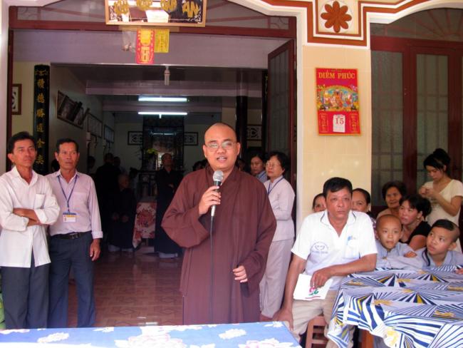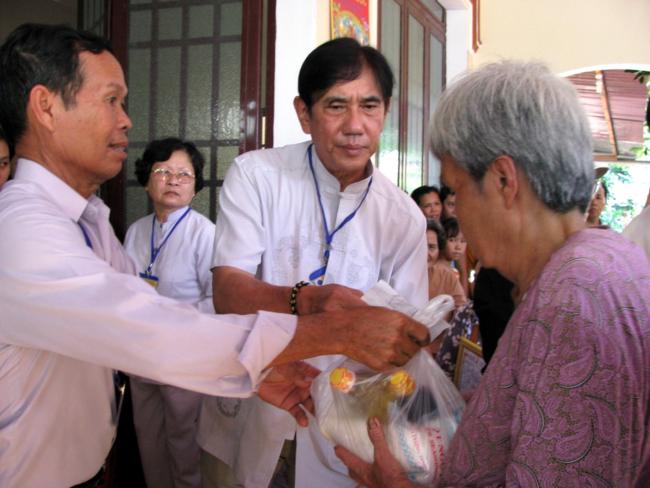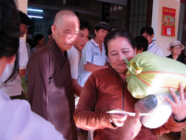 Sau đó, các phần quà được phân phát cho bà con theo phiếu cứu trợ đã được phân phát trước. Mỗi phần quà trị giá 300.000 VNĐ (bao gồm 10kg gạo, dầu ăn, nước tương, đường, bột ngọt và phong bì 100.000 VNĐ). Hơn một giờ đồng hồ, 200 suất quà được đoàn cấp phát đến tận tay người dân cùa ấp Long Hưng; Long Hòa; Long Thới thuộc xã Long Thuận. Nhiều bà con xúc động trước sự quan tâm, chia sẻ của các chư Tăng, Phật tử.