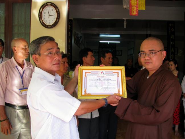 Tiếp theo, ông Trần Kinh Luân – Chủ tịch Hội Chữ Thập Đỏ xã trao giấy cảm tạ cho ĐĐ.Thích Minh Bảo, để ghi nhận sự đóng góp của Ban Từ Thiện Hương Sen bằng tình cảm nồng ấm theo đúng truyền thống, đạo lý của người Việt “Lá lành đùm lá rách”.