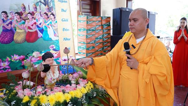Trước khi trao quà, ĐĐ. Thích Huệ Đạo đã cử hành nghi thức Tắm Phật và có lời chúc sức khoẻ và an lành đến với quý bà con nhân mùa Phật đản 2024. Rất mong những phần quà này sẽ là nguồn động viên tích cực giúp bà con vượt qua khó khăn giai đoạn ngập mặn này.