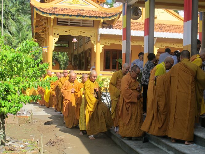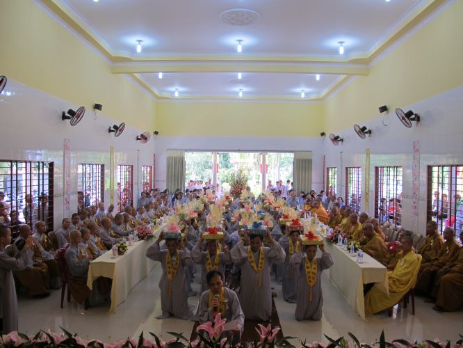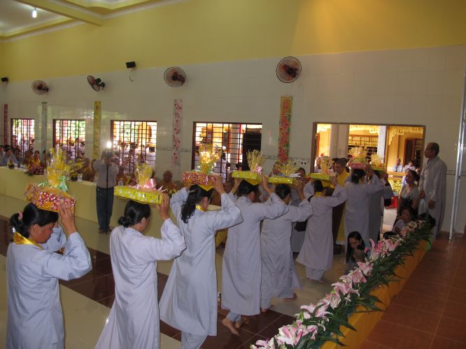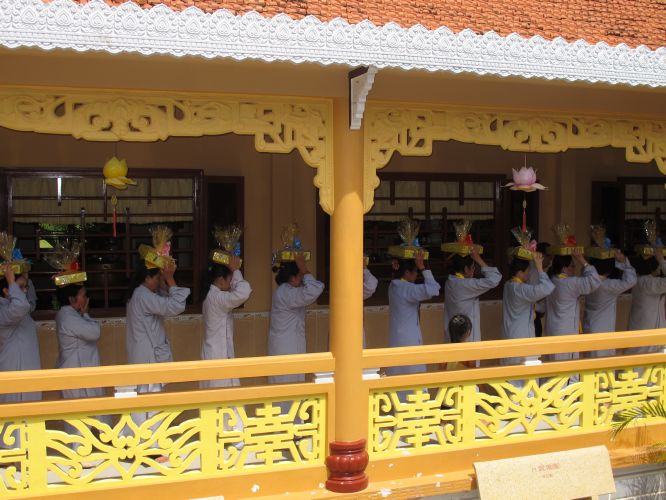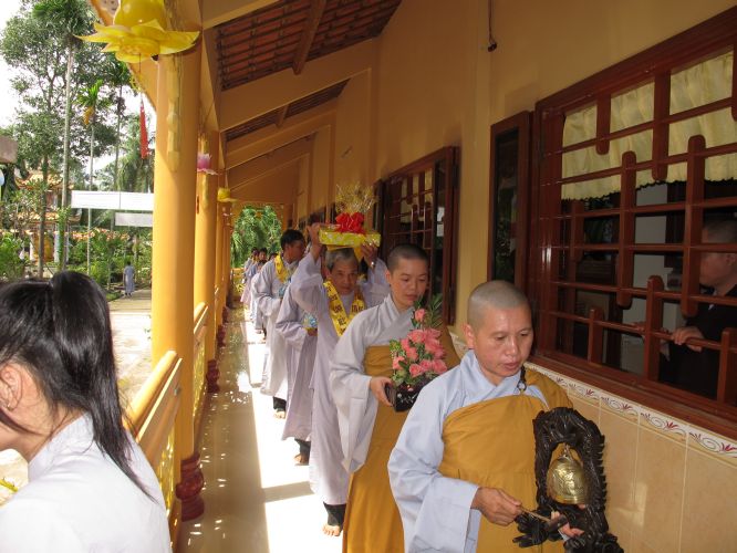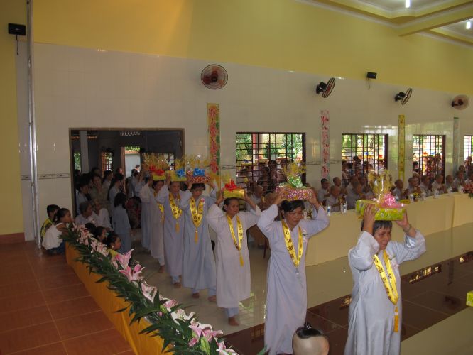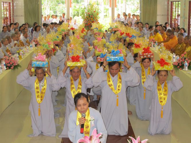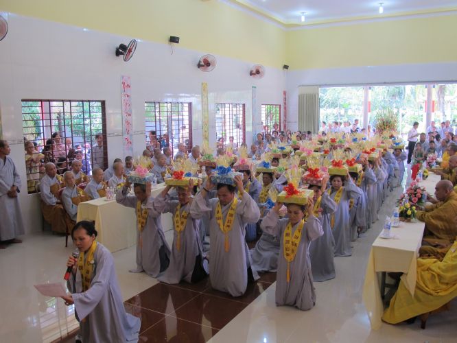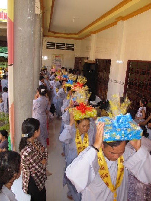 Sau nghi thức cài hoa hồng, PT Huệ Lạc đại diện chư Phật tử tuyên đọc tác bạch dâng cúng pháp y. Hàng Phật tử tuần tự đội y nhiễu quanh chư tôn đức 3 vòng trong tiếng tụng kinh trầm ấm của bài sám Vu lan.