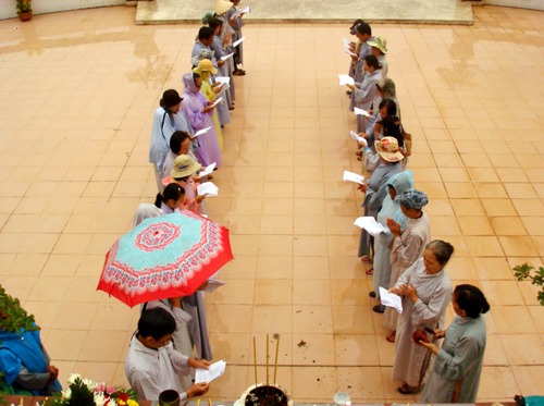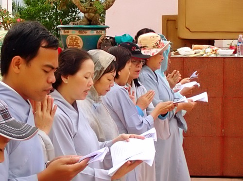 Với sự hướng dẫn của anh Thái Tín – Chúng trưởng đạo tràng, buổi lễ diễn ra với nghi thức dâng hương, dâng hoa tưởng niệm các anh hùng liệt sĩ đi kèm với ca khúc TỔ QUỐC VIỆT NAM vang lên hùng tráng trong không khí tĩnh tại nghĩa trang và phần lễ chính là khóa tụng kinh cầu siêu. Mặc dù buổi sáng hôm ấy trời mưa nặng hạt nhưng ai nấy đều nhất tâm trì tụng, mong sao cho vong linh các anh hùng liệt sĩ, các liệt sĩ đều được siêu sinh, nên khóa lễ diễn ra không kém phần trang nghiêm.