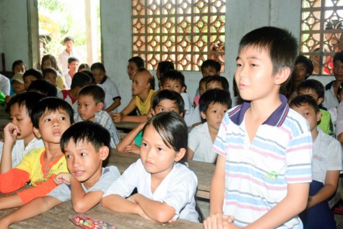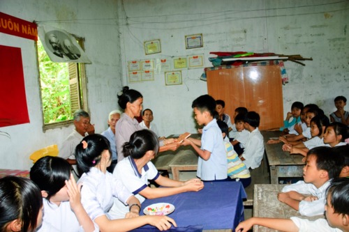 Mở đầu chương trình, sau nghi thức chào cờ, một phút mặc niệm, đại diện đạo tràng sinh hoạt với các em về 4 tiêu chí ĐẠO ĐỨC HỌC ĐƯỜNG. Các em nhiệt tình đưa tay phát biểu và có câu trả lời rất tốt. Em nào trả lời xuất sắc thì nhận thêm món quà khuyến khích của Ban Tổ Chức. Buổi trao quà diễn ra trong không khí thật đầm ấm, có sự cảm thông và biết ơn giữa Chính quyền với đạo tràng.