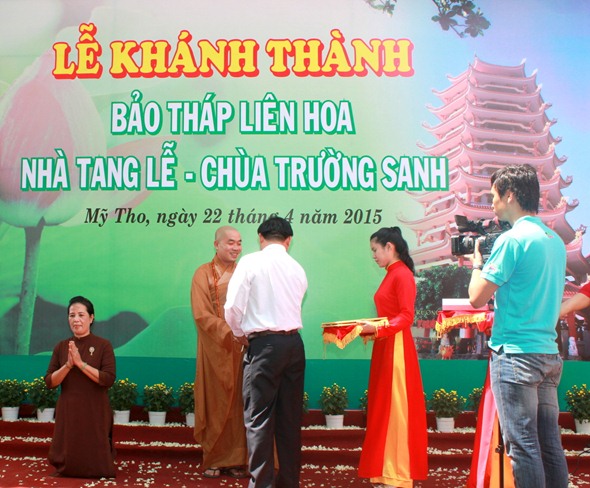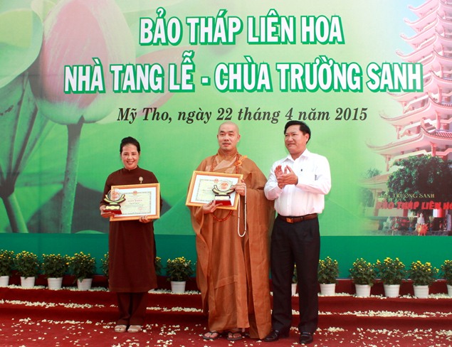 Nhân buổi Lễ, UBND thành phố Mỹ Tho đã quyết định khen thưởng, tặng quà lưu niệm cho ĐĐ Thích Quảng Lộc – Trụ trì chùa Trường Sanh và tập thể phật tử của chùa,đã có thành tích trong công tác vận động, đóng góp kinh phí cho xây dựng Bảo tháp Liên Hoa cùng nhà Tang lễ chùa Trường Sanh.