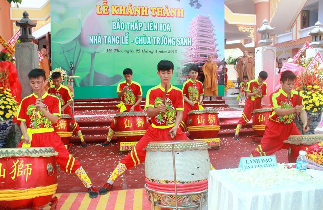 Cuối buổi lễ, đại diện Lãnh đạo chính quyền tỉnh, thành phố và Chư tôn đức Giáo phẩm chứng minh BTS GHPGVN tỉnh Tiền Giang, Chư tôn đức thường trực Ban Trị sựGHPGVN tỉnh, thành phố Mỹ Thođã long trọng cắt băng khánh thành ngôi Bảo tháp Liên Hoa và nhà Tang lễ.