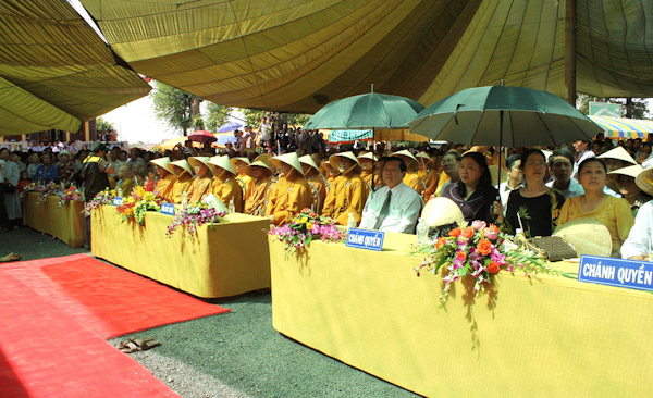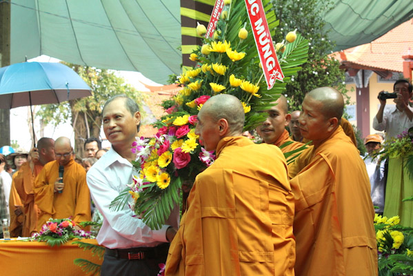 Sau khi tiến hành các nghi thức hành chánh, BTC đón nhận những lẳng hoa chúc mừng của Lãnh đạo chính quyền nhân ngày lễ An Vị Phật. Tiếp đến, Chư tôn đức Tăng Ni và Lãnh đạo chính quyền vào Chánh điện thực hiện nghi thức tâm linh lễ An Vị Phật trong không khí thật trang nghiêm.
