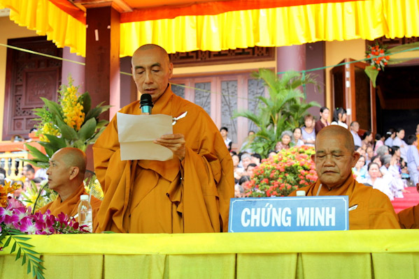 Tiếp đến, HT Thích Trí Chơn ban đạo từ, tán dương ý nghĩa của ngôi THIỀN VIỆN đứng uy nghiêm sừng sững giữa một vùng đất kinh tế chưa phát triển ở tận vùng sâu vùng xa. Để xây dựng được ngôi Tam Bảo mà nối tiếp đèn thiền tông phong của Chư Tổ nơi vùng đất này, quả thật rất khó khăn vất vả. Điều này cho thấy tinh thần hộ trì Tam Bảo của các Chư Tăng và Phật tử trong Tông môn thật sâu dầy. Cũng nhờ sự nhiệt tâm ủng hộ của Giáo hội, của lãnh đạo các cấp chính quyền địa phương, của chư Tôn đức, huynh đệ trong tông môn và nhất là chư thiện tín gần xa mà Phật sự này đã sớm hoàn thành những hạng mục chính cơ bản. Hòa thượng mong rằng trong tương lai gần, nơi đây sẽ trở thành điểm đến của những người yêu mến Đạo Phật về tu học ngày một đông hơn. Hiện nay, mỗi tháng Thiền viện đều có tổ chức khóa tu dành cho Phật tử. Đèn thiền tỏ rõ, cuộc sống nơi đây sẽ an lành, Phật tử có thêm một nơi nữa để trở về nương tựa tu học, và góp phần ổn định an sinh xã hội. Đồng thời tại huyện Tân Phước này, khi có thêm một công trình kiến trúc thẩm mỹ, một điểm đến của khách hành hương và tham quan, sẽ làm phong phú thêm đời sống tâm linh của người dân tỉnh Tiền Giang.