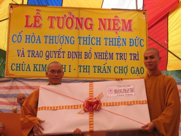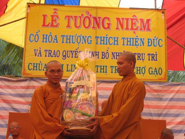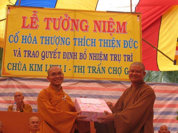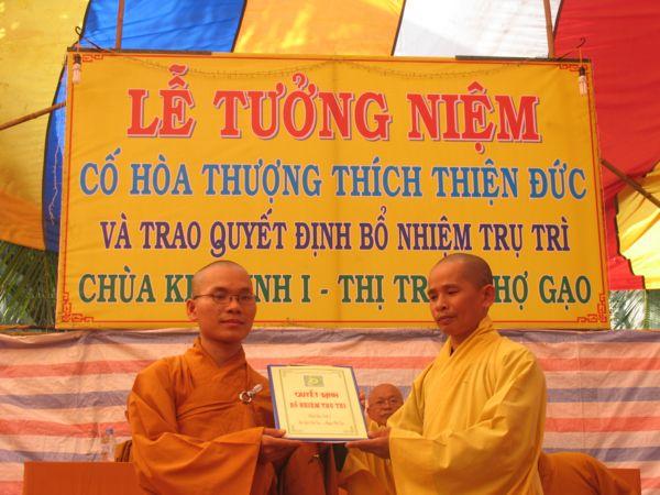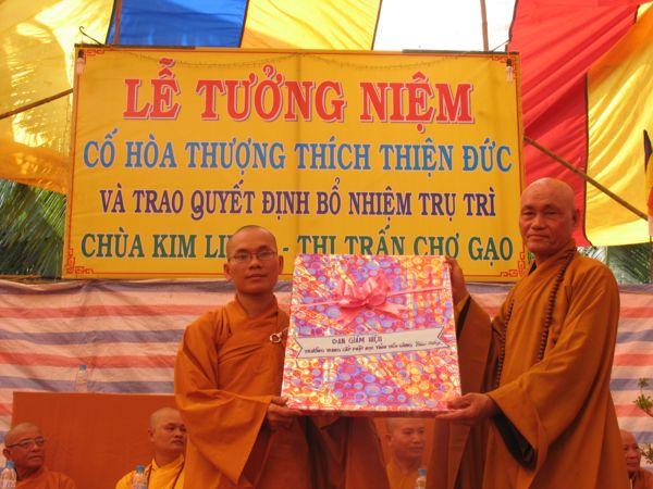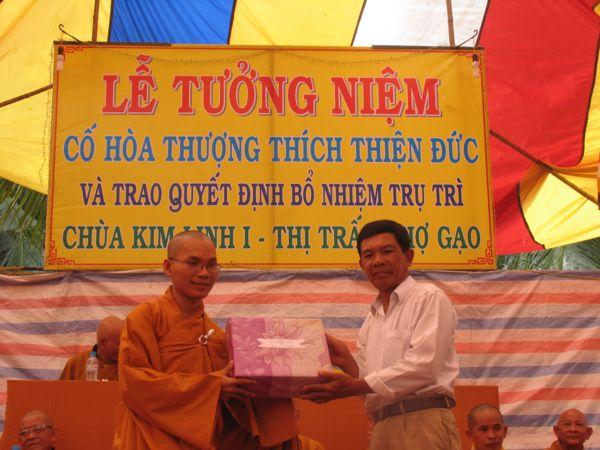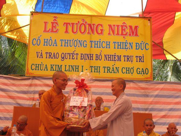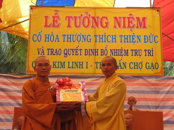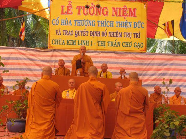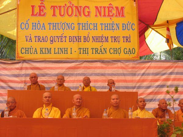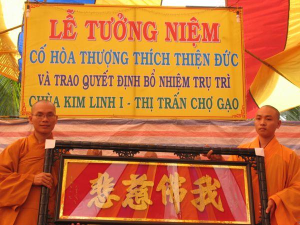 Do vậy, Ban Đại Diện Phật Giáo Huyện Chợ Gạo tiếp tục đề xuất đến Ban Trị Sự tỉnh và các cấp Chính quyền chính thức bổ nhiệm ĐĐ. Thích Thiện Tâm là Trụ trì Chùa Kim Linh I, Thị trấn Chợ Gạo. Hôm nay, nhân ngày Lễ Tưởng Niệm Tiểu Tường của cố HT. Thích Thiện Đức nguyên Trụ trì Chùa Kim Linh I, Ban Đại Diện Phật Giáo Huyện Chợ Gạo theo sự chỉ đạo của Ban Trị Sự Tỉnh Hội và sự thống nhất của lãnh đạo các cấp, các ngành địa phương tổ chức lễ trao quyết định bổ nhiệm Trụ trì Chùa Kim Linh I, Thị Trấn Chợ Gạo đối với ĐĐ. Thích Thiện Tâm.
