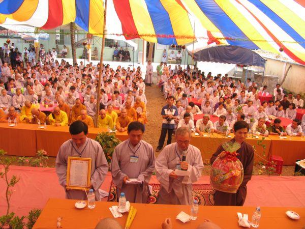 Trong niềm hoan hỷ vơ biên, Đại đức Tân Trụ trì phủ phục trước chư tơn thiền đức đọc lời phát nguyện: Được sự tin tưởng của Chư Tôn Giáo Phẩm, các cấp Chính quyền cũng như tất cả quý nam nữ Phật tử giao cho trọng trách: “trụ pháp vương gia, trì Như Lai tạng”. Con xin nguyện sẽ đem hết năng lực của mình để phụng sự đạo pháp từ đây cho đến mãi về sau hết cuộc đời mình. Nhưng đối với con, tự nhận thấy được rằng mình là người còn quá kém cỏi cả tài lẫn đức, không sao có thể làm tròn hết được trọng trách mà quý Ngài đã giao phó. Tuy vậy, con cũng xin nguyện cố gắng hết mình và con cũng mong rằng lúc nào cũng được sự dìu dắt, dạy bảo của Chư Tôn Đức Trong Ban Trị Sự Tỉnh Hội Phật Giáo Tiền Giang – Ban Đại Diện Phật Giáo Huyện Chợ Gạo để công tác Phật sự của con hoàn thành tựu.