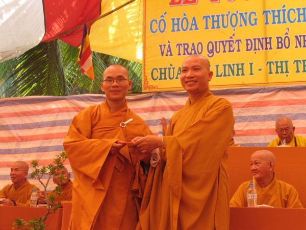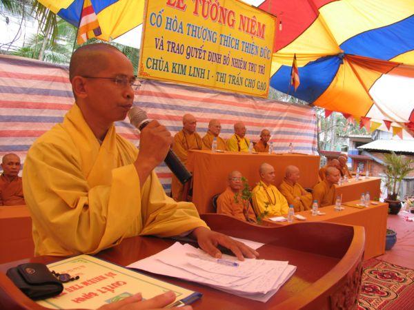 ĐĐ. Thích Nhuận Đức thay mặt chư tơn đức trong BTS Phật giáo tỉnh Tiền Giang đọc quyết định bổ nhiệm trụ trì cho ĐĐ. Thích Thiện Tâm.