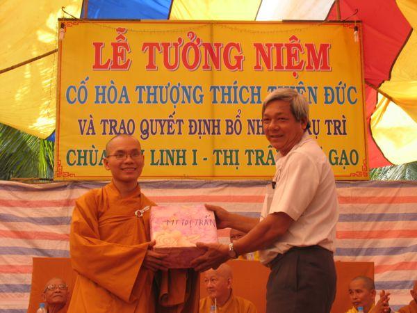 ĐĐ. Thích Thiện Hải – Ủy viện BTS, Chánh đại diện Phật giáo huyện Chợ Gạo trao quyết định.