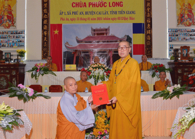ĐĐ.Thích Ngọc Trí – Phó Văn phòng BTS GHPGVN tỉnh Tiền Giang thừa ủy nhiệm của chư Tôn đức Thường trực công bố quyết định do TT.Thích Quảng Lộc – Trưởng BTS GHPGVN tỉnh Tiền Giang ấn ký cho SC.Thích Nữ Thiên Phú làm Trụ trì chùa Phước Long.