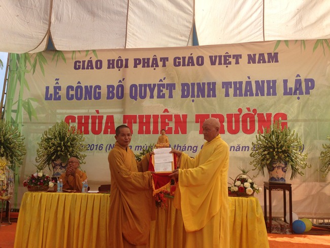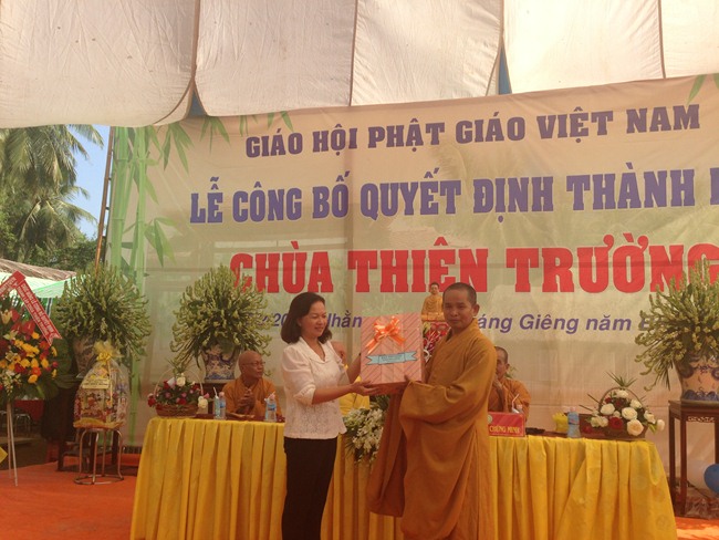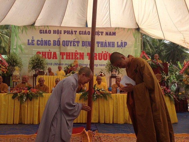 Tại buổi lễ Ban tổ chức đã công bố quyết định thành lập chùa Thiên Trường của BTS GHPGVN tỉnh Tiền Giang trao cho TT. Thích Thiện Hải, Trưởng BTS PG huyện Chợ Gạo và Thông qua quyết định của BTS tỉnh, Phật giáo huyện Chợ Gạo đã trao quyết định bổ nhiệm giám tự và con dấu chùa Thiên Trường cho ĐĐ. Thích Giác Hiếu.