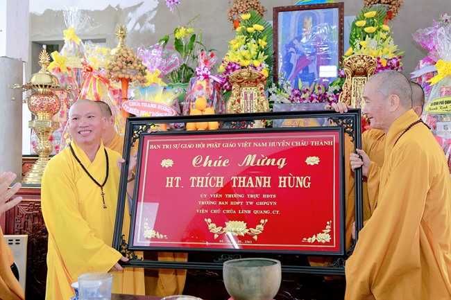 Nhân đây, TT Thích Nhuận Đức – Phó thường trực BTS GHPGVN huyện Châu Thành tán thán ĐĐ Thích Đức Trung đã từng bước hoàn thành trách nhiệm mà bậc Thầy tổ, Giáo hội địa phương giao phó. Trong đó Đại đức luôn được sự dạy dỗ, hỗ trợ và chia sẻ những khó khăn trong việc tu hành, trong quá trình xây dựng chùa từ HT Thích Thanh Hùng. Đó là một sự khích lệ với thật nhiều tình thương đối với những tu sĩ trẻ tu hành chân chánh, luôn biết cống hiến – phụng sự. Cho nên, đứng ở gốc độ Giáo hội địa phương, TT Thích Nhuận Đức kính cẩn ghi nhận những đóng góp của Hòa thượng đối với chùa Linh Quang, và đồng thuận cung thỉnh Ngài làm Viện chủ. Đồng thời, Thượng tọa đại diện BTS huyện Châu Thành đã tặng quà chúc mừng HT Thích Thanh Hùng.