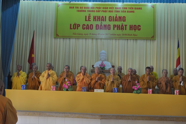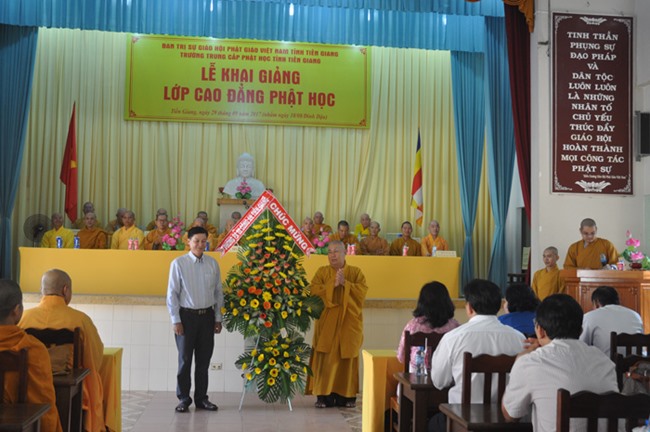 Theo đó, Ban Trị Sự, Ban Giáo Dục Tăng ni tỉnh Tiền Giang rất quan tâm công tác đào tạo Tăng tài có đầy đủ kiến thức Phật học và chất liệu tu tập cho Giáo hội. Vì vậy, sau thời gian nổ lực kiến tạo cơ sở vật chất, được sự cho phép của HĐTS và các ban ngành tỉnh Tiền Giang, Ban Trị Sự rất hoan hỷ khi có thể tổ chức Lễ Khai Mạc Lớp Cao Đẳng Phật Học khóa I ngày hôm nay. Công việc này đánh dấu bước ngoặc mới trong công tác Giáo dục Tăng Ni tại tỉnh nhà. Tuy vậy, công việc còn có nhiều thách thức ở phía trước mà không phải chỉ có người dạy và học cần vượt qua; mà nó còn đòi hỏi tất cả chư Tôn đức tăng trong tỉnh phải nổ lực hộ trì mới mong có được thành tựu tốt đẹp.