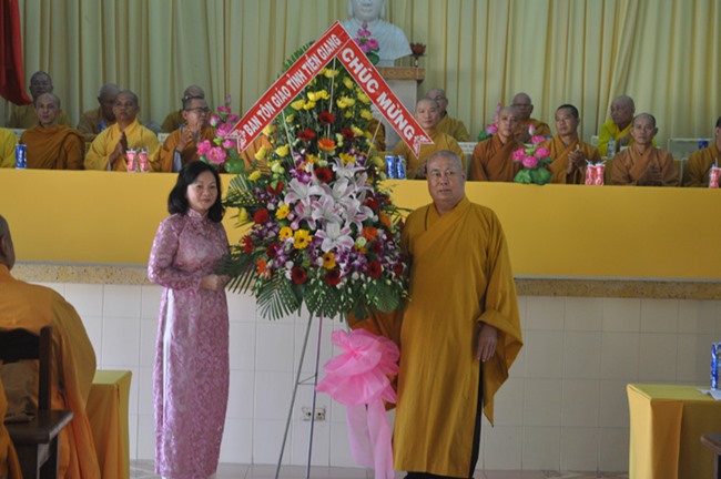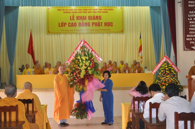 – Bà Bùi Thị Mai thay mặt lãnh đạo các ban ngành phát biểu trong buổi Lễ. Bà nói: Ban Trị Sự cũng như Ban Giáo Dục Tăng Ni tỉnh Tiền Giang thời gian qua hoạt động rất hiệu quả. Đây là lớp Cao Đẳng Phật Học đầu tiên tại tỉnh nhà được hình thành, đó là niềm vui lớn của Ban Trị Sự, hy vọng trong quá trình điều hành và giảng dạy, quý vị luôn tuân thủ theo Hiến chương Giáo hội và mô hình giảng dạy của Ban Giáo Dục Tăng Ni Trung ương để cho công tác giáo dục chuyên môn có hiệu quả. Xin được gửi lời chúc tốt đẹp nhất đến toàn thể quý vị.