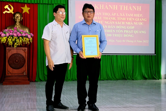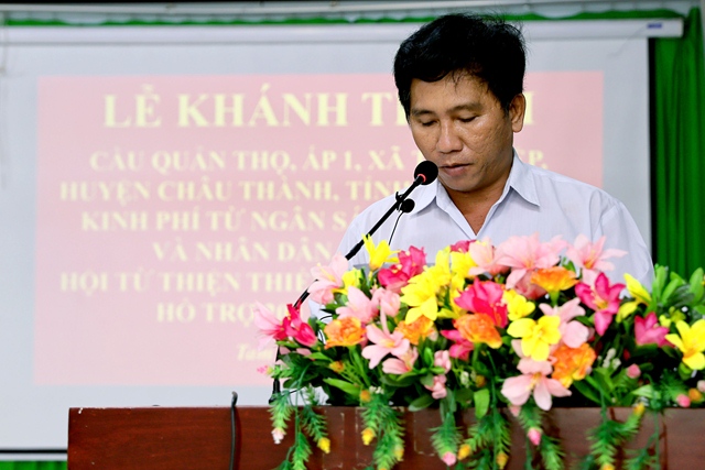 Tiếp theo, ông Nguyễn Văn Nâu, Huyện Uỷ viên, Bí thư Đảng ủy, Chủ tịch UBND xã Tam Hiệp gửi lời cảm ơn đến ông Huỳnh Văn Hải, Phó Chủ tịch UB MTTQVN tỉnh Tiền Giang và Hội Từ Thiện Thiền Tôn Phật Quang (BRVT) đã quan tâm ủng hộ nhân dân ấp 1, xã Tam Hiệp xây dựng một cây cầu, mang lại nhiều lợi ích cho người dân địa phương trong việc ổn định cuộc sống, yên tâm lao động, sản xuất. Chúng tôi vô cùng biết ơn những tấm lòng thiện tâm mà Hội Từ Thiện Thiền Tôn Phật Quang (BRVT) đại diện mang đến. Và Ông đã trao thư cảm ơn của UBND xã Tam Hiệp đến đại diện Hội Từ Thiện Thiền Tôn Phật Quang.