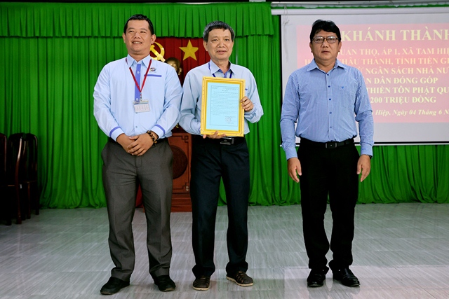 Tiếp theo, Ông Nguyễn Văn Nâu – Chủ tịch UBND xã Tam Hiệp nhận quyết định bàn giao công trình cầu giao thông nông thôn từ Ông Phạm Ngọc Lâm – Phó Chủ tịch MTTQ huyện Châu Thành.