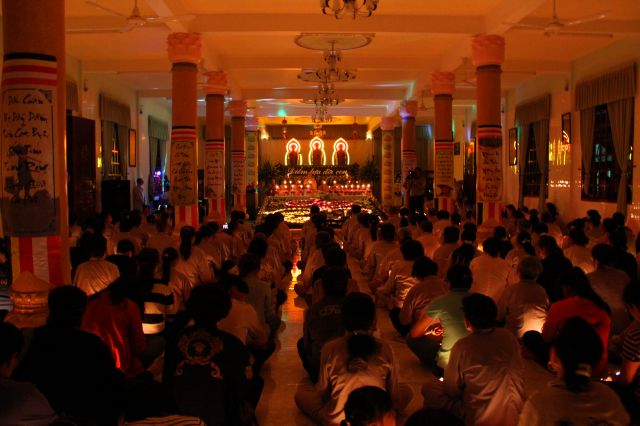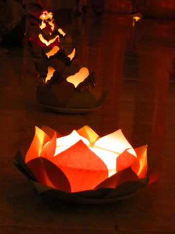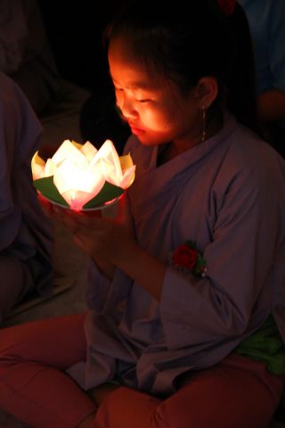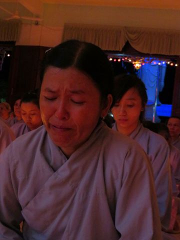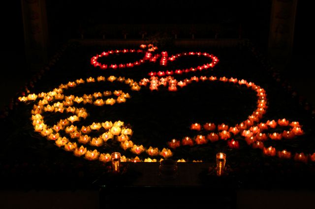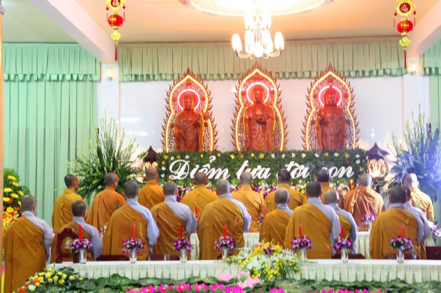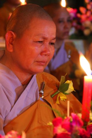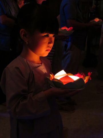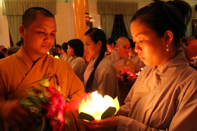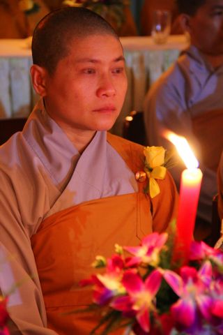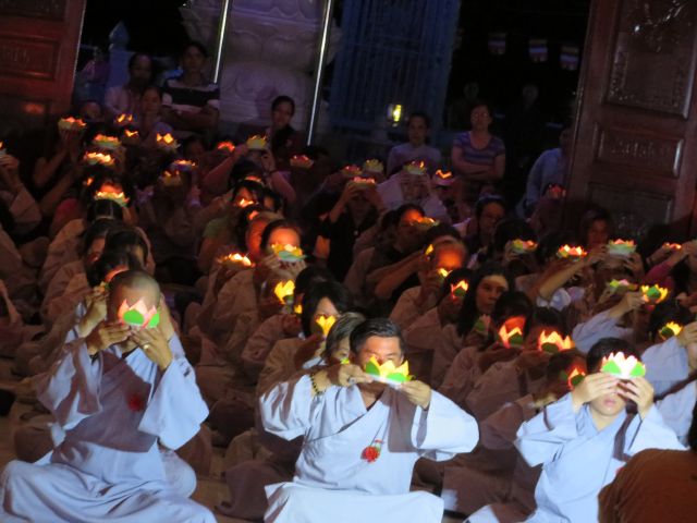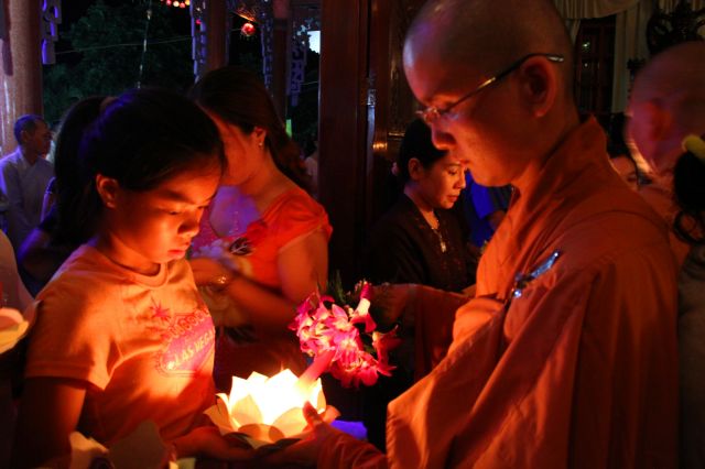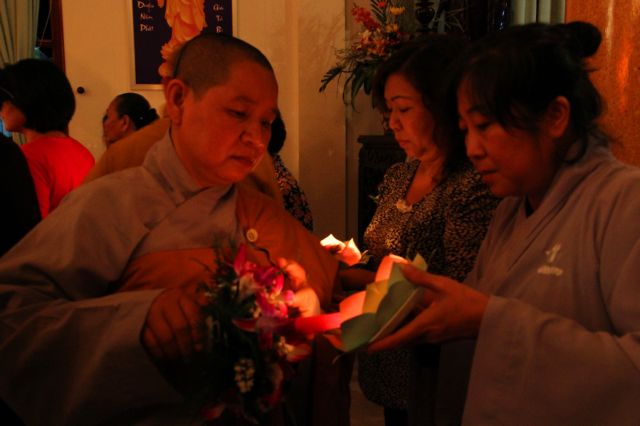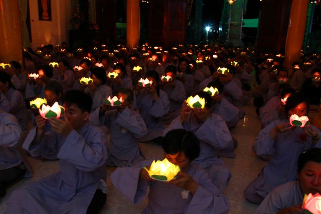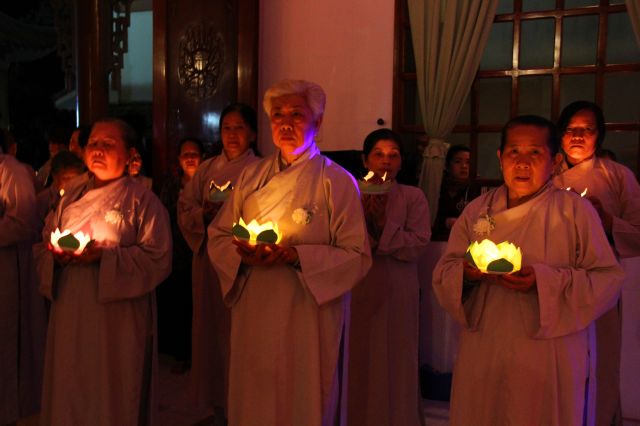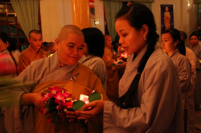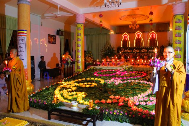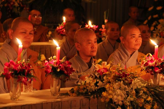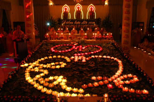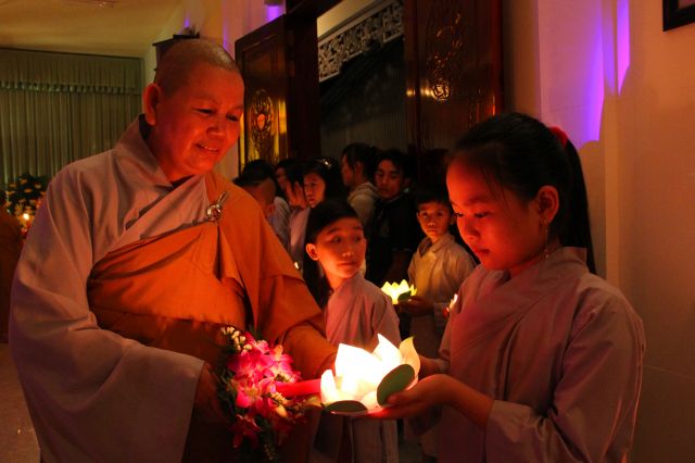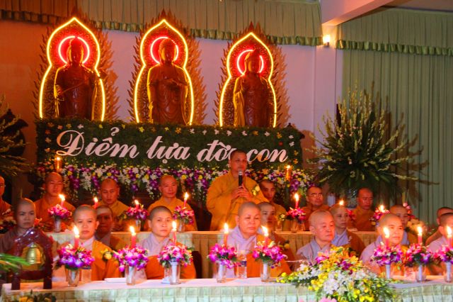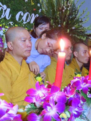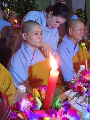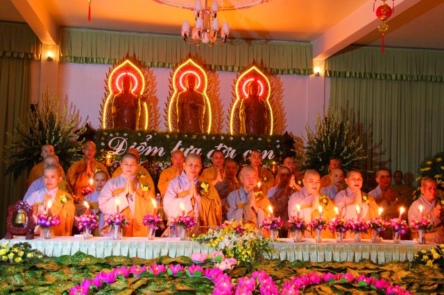Sau thời pháp thoại là nghi thức thắp nến tri ân. Từng ngọn nến lung linh được chư tôn đức thắp sáng lên bằng ngọn lửa mồi nơi bàn thờ Phật, như ánh quang minh của đức Thế tôn soi rõ từng khuôn mặt, thắp sáng niềm tin và trí tuệ để những người con tìm về bến đỗ bình yên của cuộc đời.