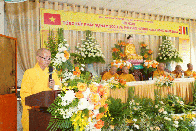 SC.Thích Nữ An Thảo – Chánh Thư ký BTS GHPGVN huyện Tân Phước báo cáo tổng kết công tác Phật sự năm 2023. Theo đó, trong năm qua BTS Phật giáo huyện Tân Phước đã ký ban hành 15 văn thư. Tổ chức thành công Đại lễ Phật Đản năm 2023, tổ chức Tết Trung thu ấm áp cho thanh thiếu niên. Ngành Tăng sự năm qua giải quyết được một số việc quan trọng cần thiết và kịp thời, thành lập mới một cơ sở thờ tự, nhập danh bộ 02 vị, bổ nhiệm trụ trì 01 vị, giới thiệu Tăng Ni xin thọ giới 05 vị, xuất gia 02 vị.