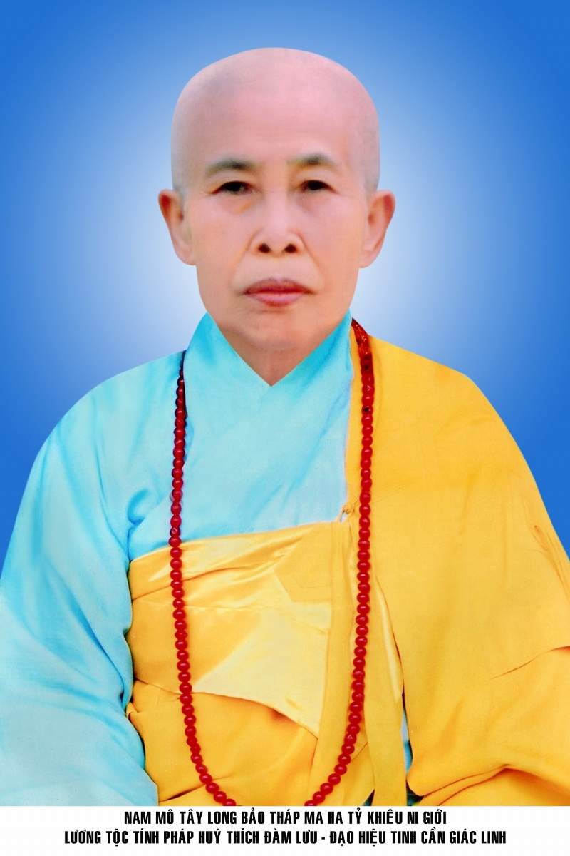 Nam Mô Tào Động phái Tây Long Bảo Tháp Ma Ha Sa Môn Tỷ Khiêu Ni giới Lương tộc tính Pháp húy Thích Đàm Lưu đạo hiệu Tinh Cần Giác Linh Thiền Tọa hạ thùy từ chứng giám.