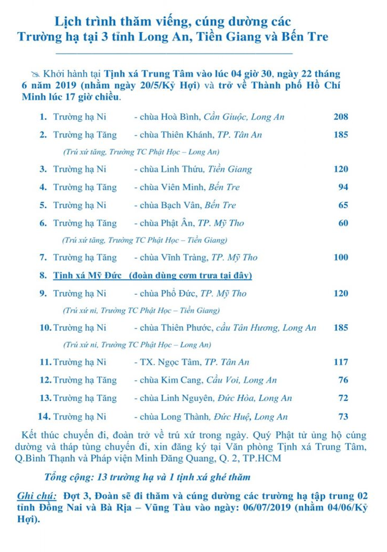 Sáng ngày 16/06/2019 (nhằm 14/05/Kỷ Hợi), Hòa thượng Minh Thuấn – Phó Trụ trì Pháp viện Minh Đăng Quang và Thượng tọa Minh Lộc – Phó Trụ trì TX.Trung Tâm đã theo sự chỉ dạy của Hòa thượng Giác Toàn hướng dẫn chư Tăng, quý Phật tử cùng tháp tùng theo đoàn của chư Tôn đức giáo đoàn IV đến thăm viếng và cúng dường 130 hành giả Tăng – Ni tại Hạ trường Tổ đình Minh Đăng Quang (Xã Hậu Lộc, Huyện Tam Bình, Tĩnh Vĩnh Long).