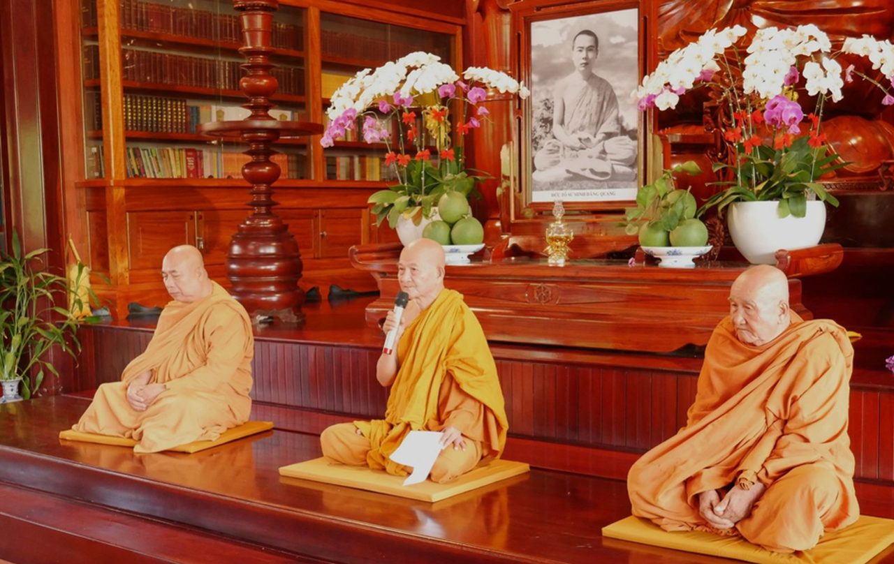Chư Tăng và Phật từ nghe lời huấn từ của Hòa thượng chứng minh