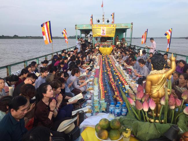 Buổi chiều, tại bến phà Mễ Sở – HN, hai câu lạc bộ thanh niên Phật tử đã có buổi lễ phóng sinh – tắm Phật – thả hoa đăng cầu nguyện cho thế giới hòa bình, nhân dân an lạc hạnh phúc. Hơn 7 tạ cá cùng chim, ốc và 17kg lươn đã được thả tự do về với cuộc sống, không còn chịu cảnh “lồng chậu lưới”, không còn bị đe dọa sự sống từng giờ từng phút. Giữa con sông êm đềm bên ngoại thành, dưới sự chứng minh của mười phương chư Phật, toàn thể đại chúng đã lắng nghe Đại đức Thích Thanh Tâm – Ủy viên Ban hoằng pháp TW chia sẻ về ngày Phật đản, cũng như ý nghĩa nghi thức tắm Phật – một nghi thức quan trọng trong mỗi buổi lễ Phật đản tại các chùa, tự viện. Đồng thời, đại chúng đã cùng thực hiện nghi thức tụng kinh Phật đản, làm lễ tắm Phật bằng tất cả tấm lòng thành kính của người con Phật hướng về ngày đản sinh của Đức Từ Phụ.
