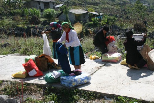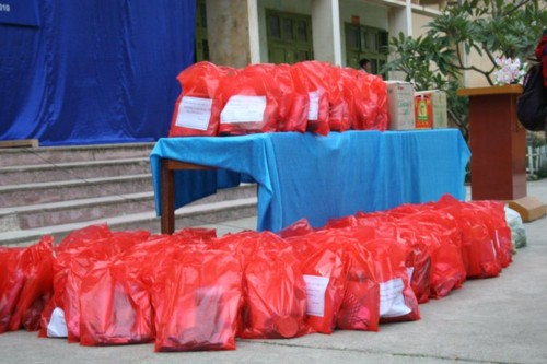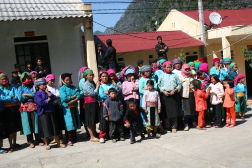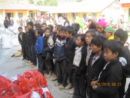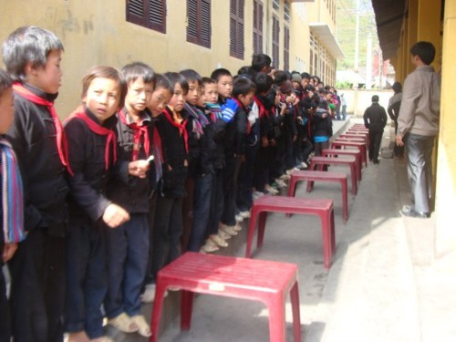 Khi Thầy trò chúng tôi đến nơi, các em học sinh đã nhanh nhẹn kê ghế xếp hàng thẳng lối. Sau lời phát biểu chào mừng và cảm ơn của đại diện lãnh đạo huyện Đồng Văn, của ban giám hiệu Trường; Thầy tôi và bác Việt (bác sĩ đi chăm sóc sức khoẻ cho đoàn) đã trao 200 suất quà cho các em học sinh.