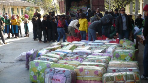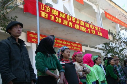 Nhận món quà nhỏ trên tay, chị Vàng Mỷ tươi cười nói chuyện, phải nhờ một cán bộ tại xã phiên dịch, chúng tôi mới hiểu được những gì chị tâm sự. Mặc dù chị phải dậy từ sáng sớm, đi bộ vượt qua con đường gần 6 km đường núi để đến đây nhận quà nhưng chị rất vui vì mùa đông năm nay đã có chăn ấm, chỉ gửi lời cảm ơn đoàn rất nhiều.