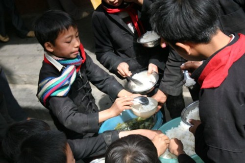 Ở đây, các em ăn cơm theo bàn, mỗi bàn 8 người. Chúng tôi lặng người nhẩm tính : 100 em đi chợ hết 480.000đ/ngày, suy ra khẩu phần của 1 em là 4.800đ/1 ngày, với số tiền ấy không đủ cho trẻ em dưới Hà Nội một lần ăn vặt chứ chưa nói là ăn cả ngày. Nhìn bữa cơm của các em thiếu thốn vô cùng, Thầy trò chúng tôi lại ứa lệ.