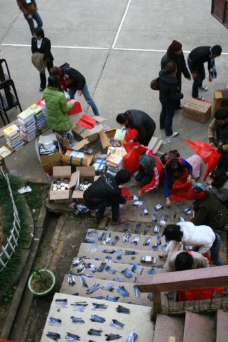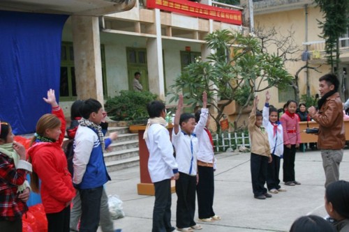 Chúng tôi nhanh nhẹn chia làm 3 nhóm: 1 nhóm do Thầy tôi đứng đầu làm việc với ban giám hiệu; 1 nhóm lớn chuyển đồ và phân chia thành 200 suất quà; còn 1 nhóm nhỏ khác thì chủ động giao lưu, làm quen và hướng dẫn các em chơi trò chơi, học một số bài hát.