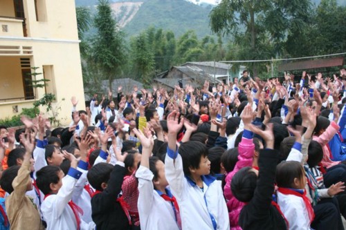 Sau khi trao quà cho các em, chúng tôi nắm tay nhau thành vòng tròn và cất vang bài hát “Nối vòng tay lớn”.