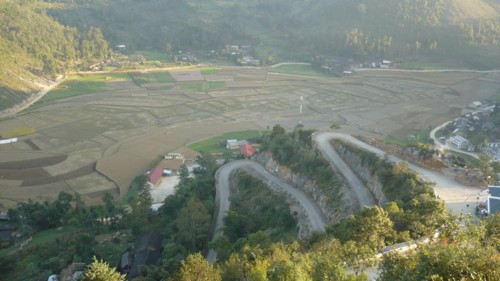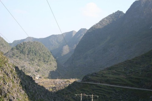 Quang cảnh đường đi không khác quãng đường từ Hà Giang lên Đồng Văn là mấy, cũng là trùng trùng lớp lớp những ngọn núi, những con đường uốn khúc quanh co, khúc khuỷu. Phía dưới thấp thoáng, lác đác những ngôi nhà vách đất với mái lợp đơn sơ, cô quạnh nằm ẩn hiện giữa trùng điệp núi rừng Tây Bắc.