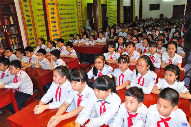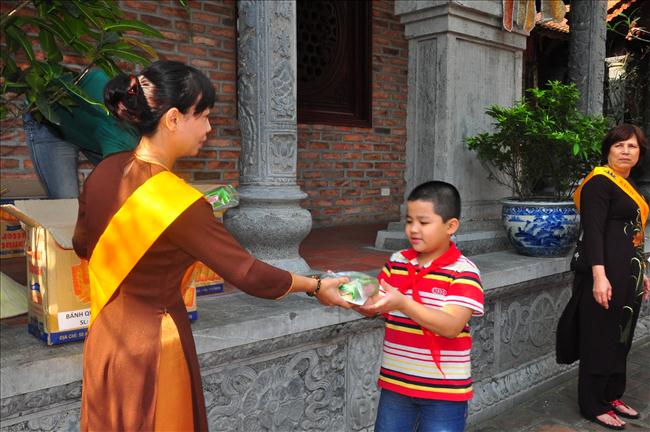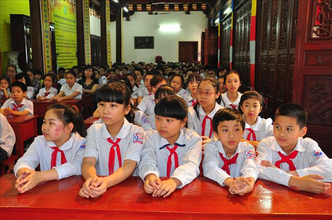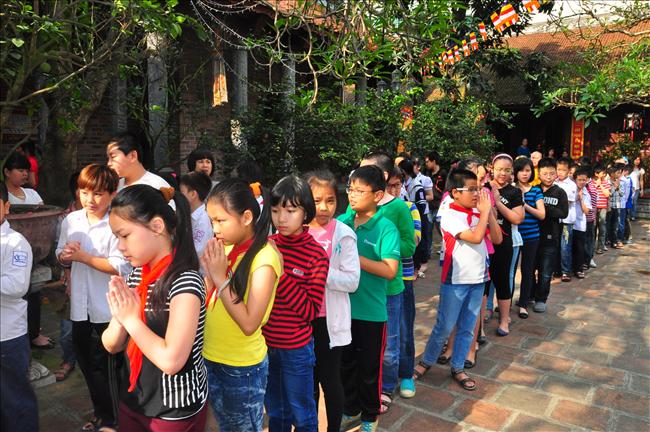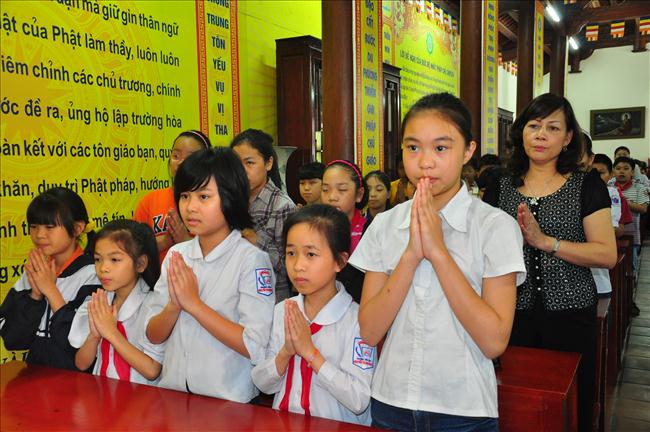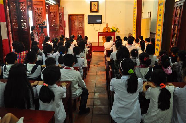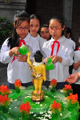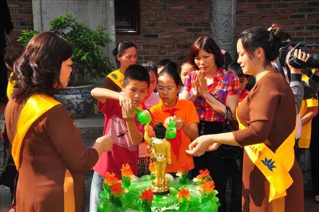 Buổi chiều cùng ngày, các thầy cô giáo và các em học sinh trường tiểu học Nguyễn Trung Trực đã vân tập về Tổ đình Hồng Phúc – Hòe Nhai để làm lễ tắm Phật dưới sự chủ trì của Đại đức Thích Tâm Hoan. Đại đức cũng đã có đôi lời chia sẻ với các em học sinh về ý nghĩa của lễ Phật Đản, đồng thời Đại đức mong rằng các em sẽ cố gắng chăm ngoan học giỏi, hiếu kính với cha mẹ, vâng lời thầy cô giáo, sống hòa hợp với mọi người, phấn đấu trở thành người công dân tốt, có ích cho đất nước.