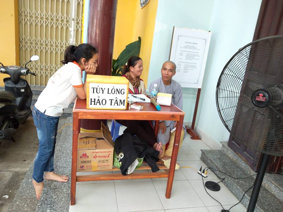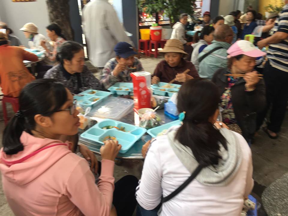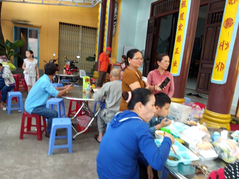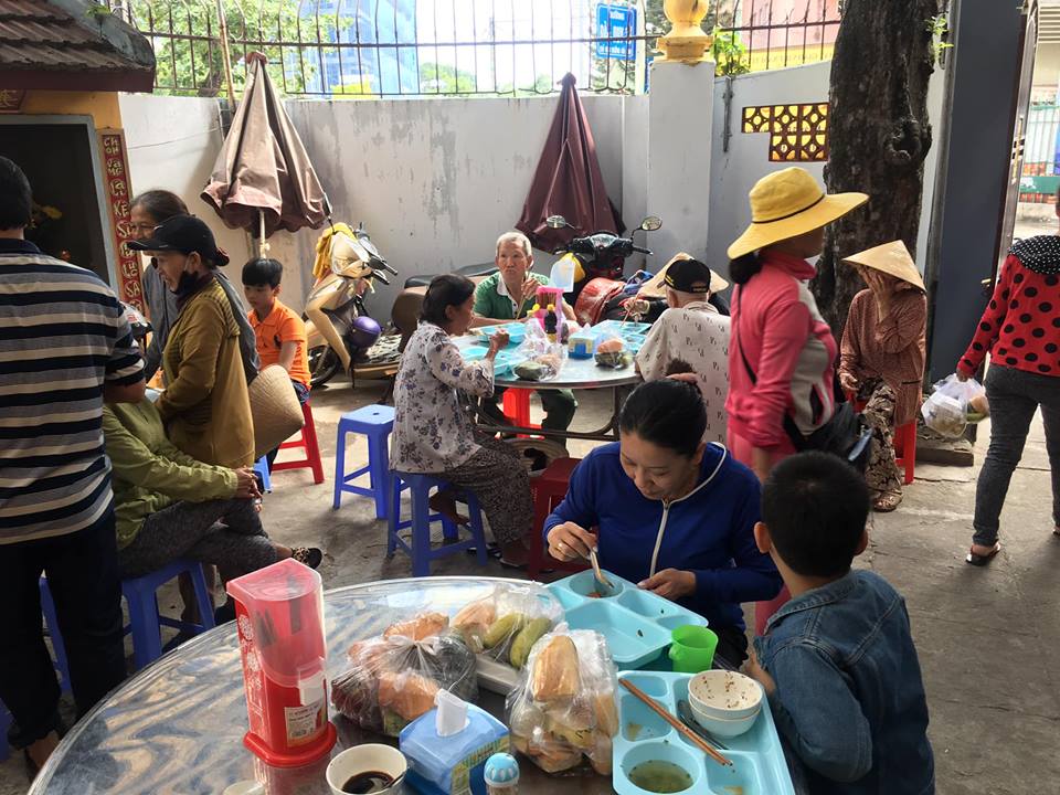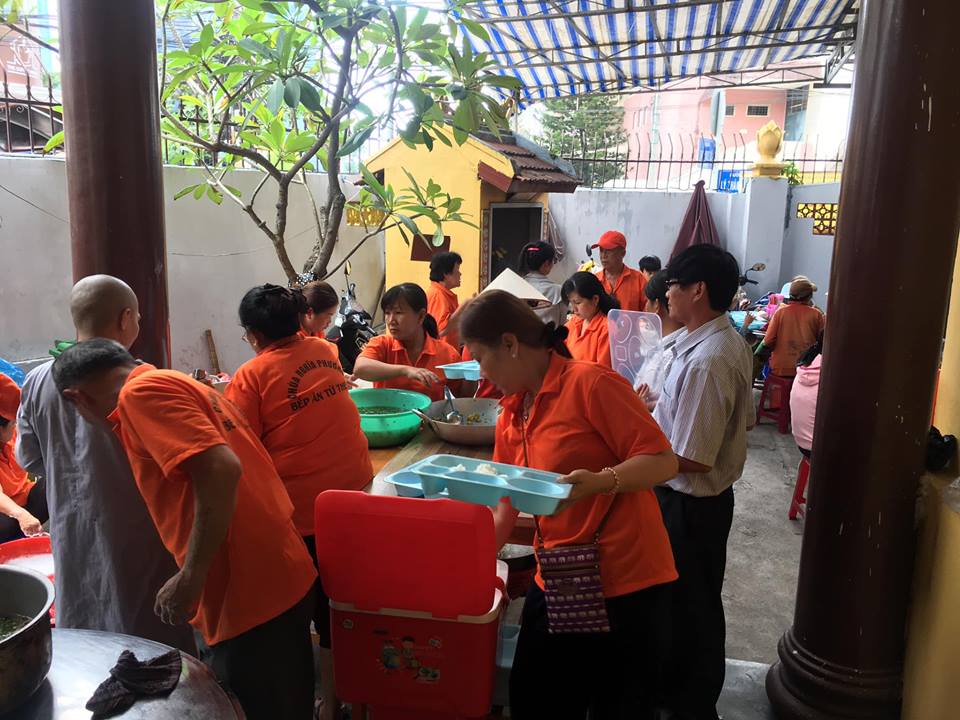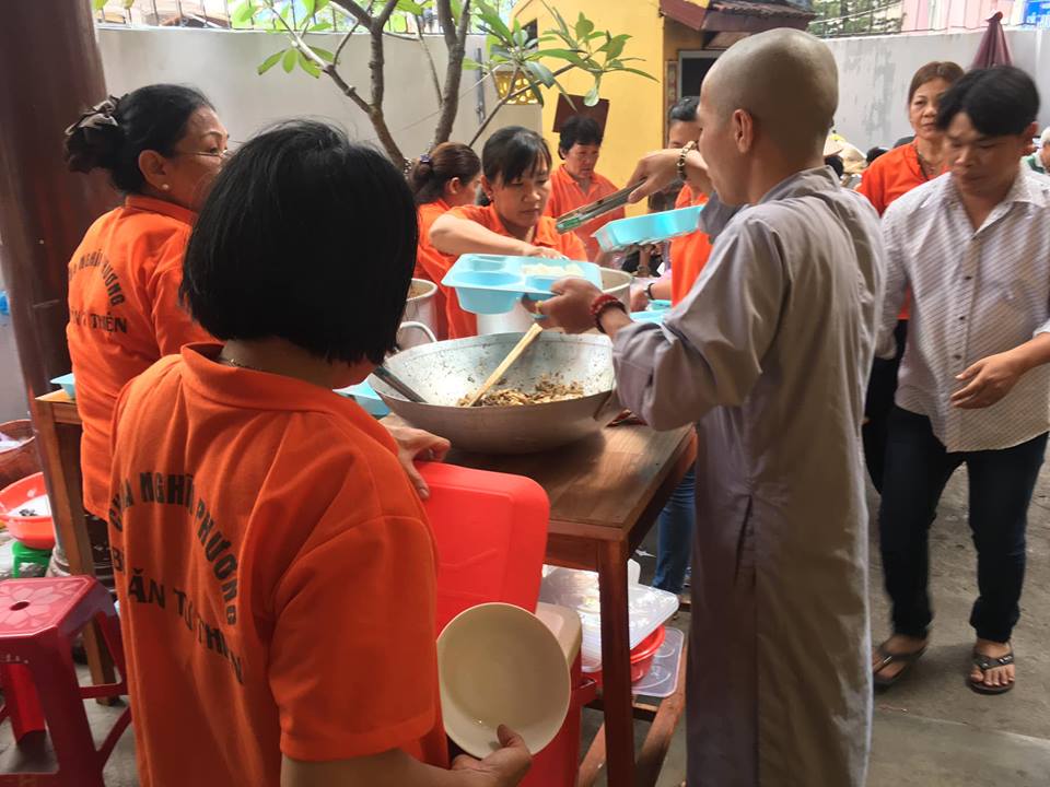 Thượng tọa Thích Thiện Phước chia sẻ: bếp ăn từ thiện phục vụ mỗi tháng 2 lần vào ngày mùng một và 15 âm lịch, kết duyên lành cho bà con Phật tử ăn chay giảm trừ nghiệp sát. Hôm nay  bếp ăn phục vụ trên 600 thực khách. Trong thời gian qua bếp ăn  phục vụ  trên 5 ngàn phần cơm chay, ăn tại chỗ và mang về nhà.. Thực phầm được sự trợ duyên của Phật  tử nên thay đổi thường xuyên: cơm trắng, bánh mì, canh rau,  cà rốt và su xào đậu, canh bí đỏ đậu phụng, canh bí xanh, đậu hủ kho. nấm kho, rau muống chiên, rong biên, kim chi, xôi, chuối, ngày tổng kết hôm nay có quà bánh chưng đem về.